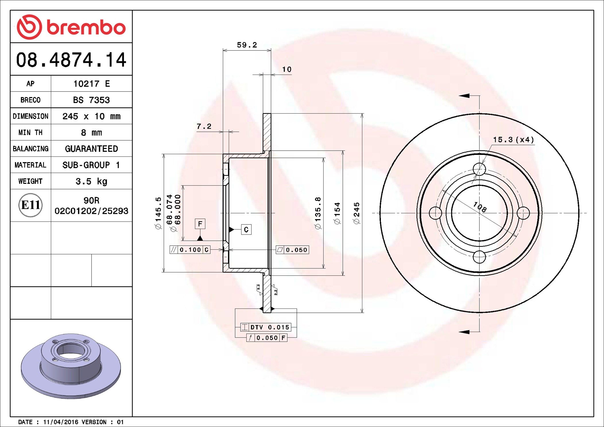 BREMBO 08.4874.14 | Fren Diski Arka Düz 245 mm (Audi: 80 1.6 1.8) | 2 Adet