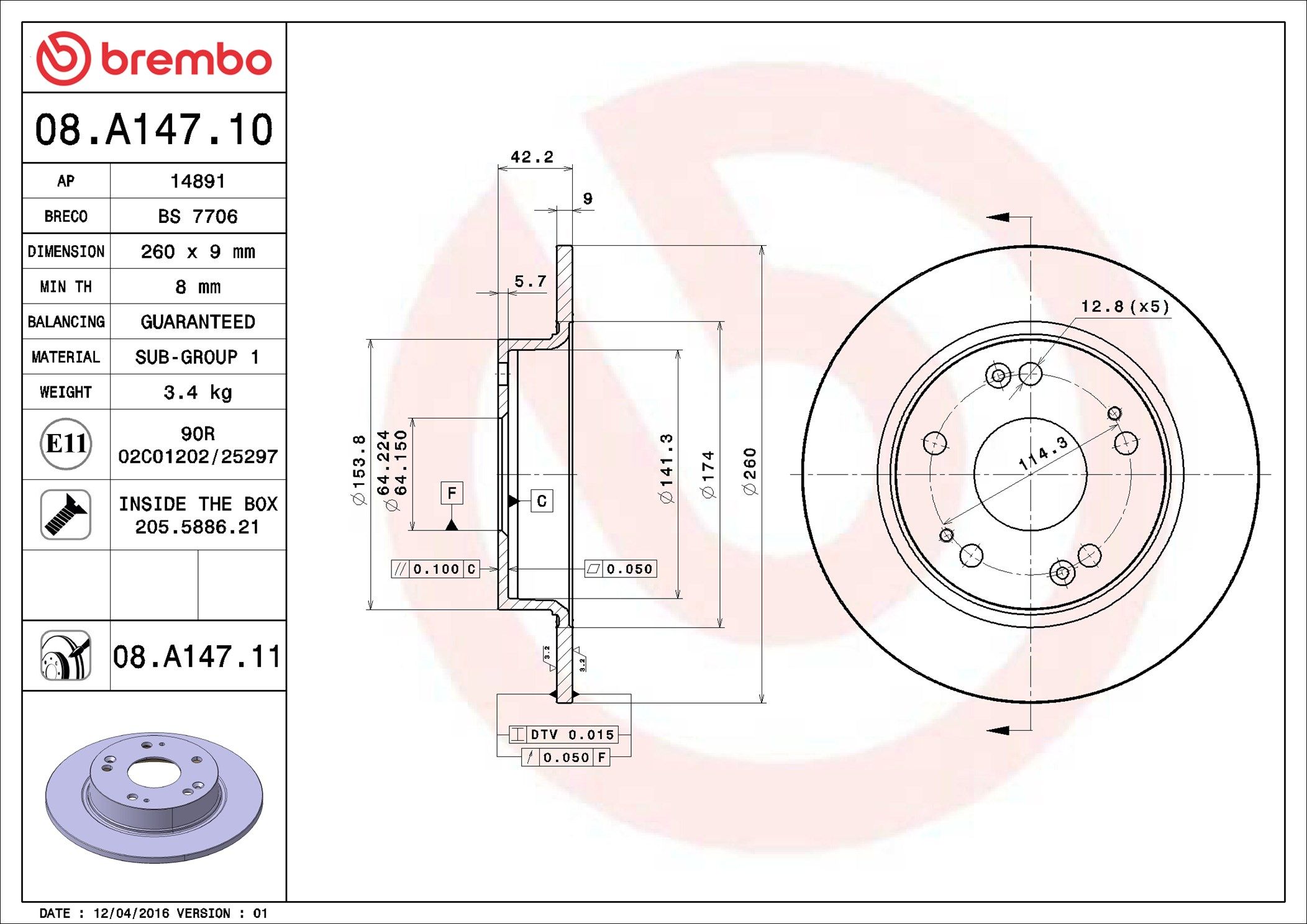BREMBO 08.A147.11 | Fren Diski Arka Düz (260-5)-(Honda Civic 2007 / 2011 Hb-Sedan / Civic 2012 / 2013 Sedan) UV Coated | 2 Adet