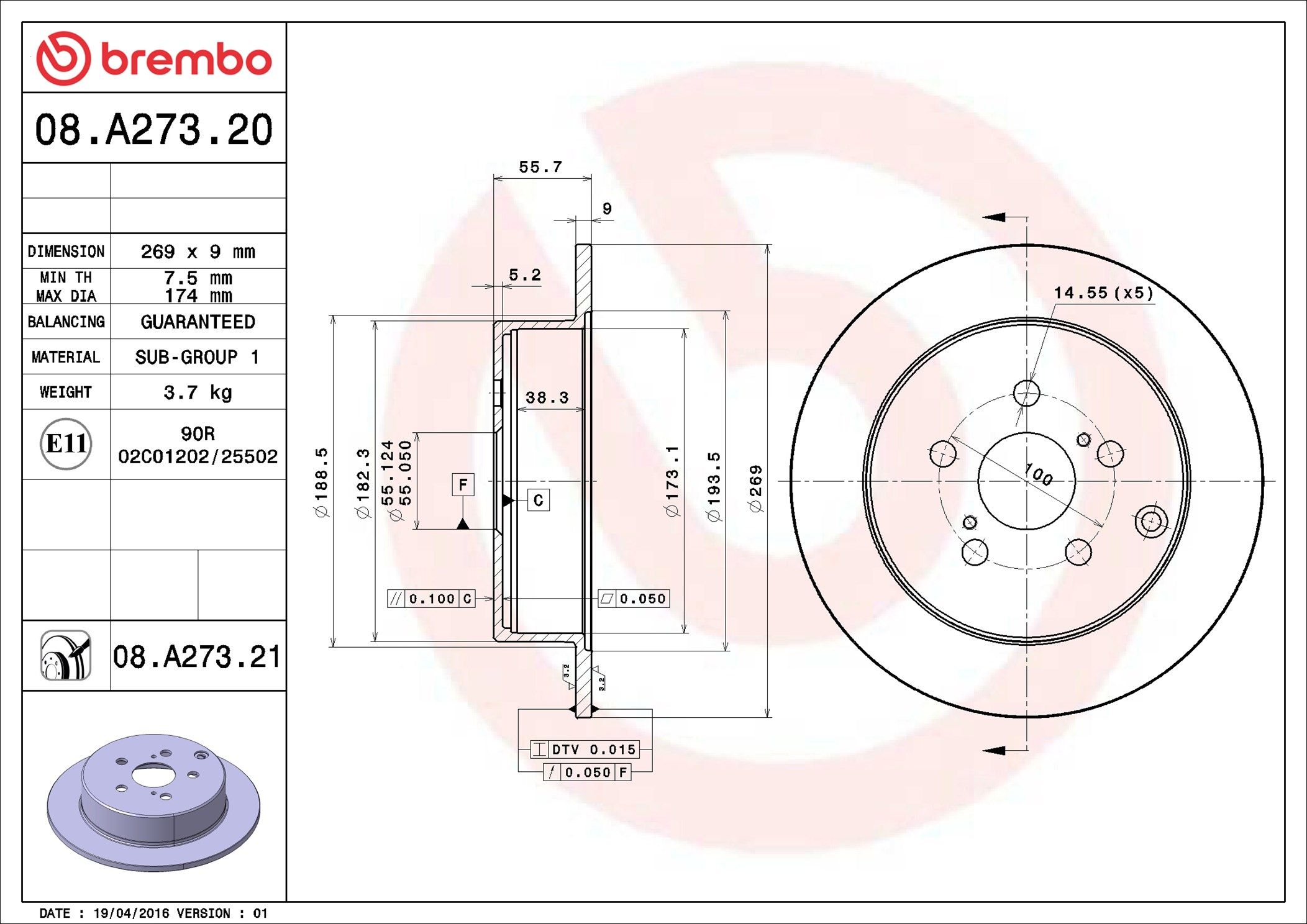 BREMBO 08.A273.21 | Fren Diski Arka Kaplamalı Toyota Matrix | 2 Adet
