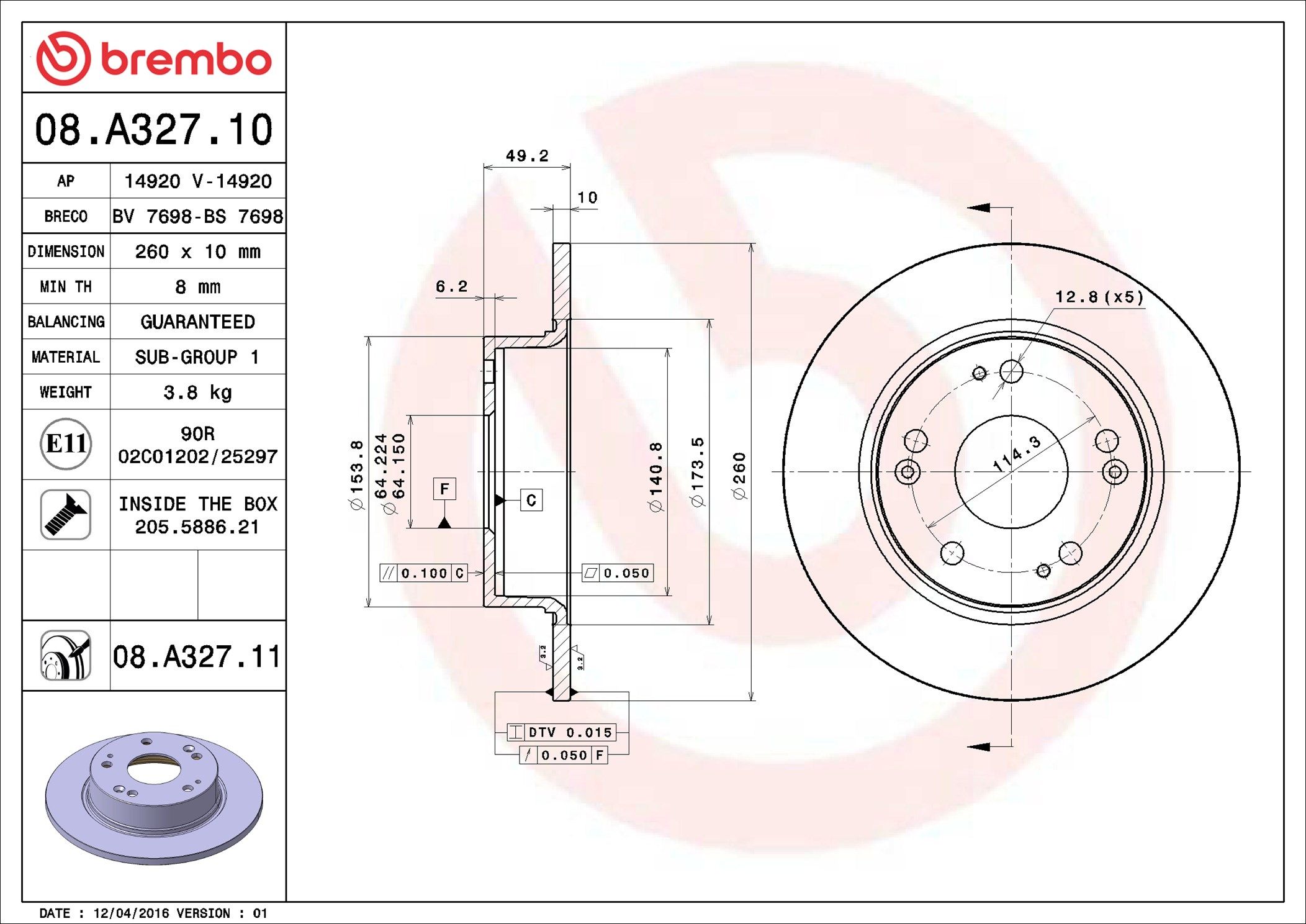 BREMBO 08.A327.11 | Fren Diski Arka Düz (260-5)-(Honda Accord 2003 / 2008 2.0) | 2 Adet