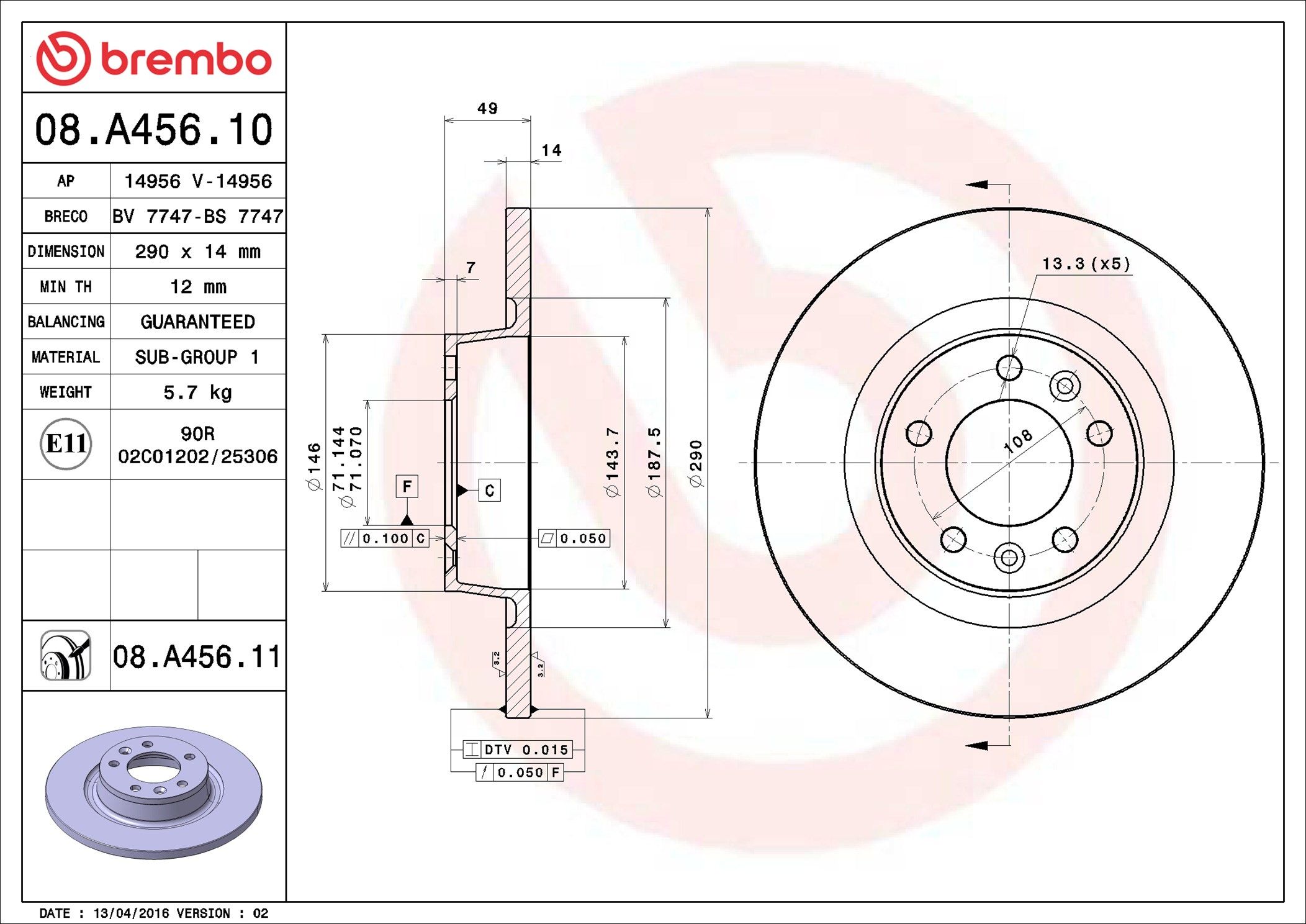 BREMBO 08.A456.10 | Fren Diski Arka Düz 290mm (Fiat: Scudo / Citroen: Jumpy / Peugeot: Expert 1.6 HDI 2.0 HDI 07-) | 2 Adet