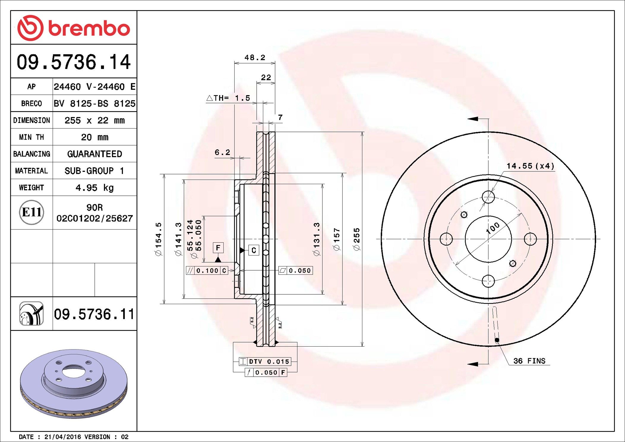 BREMBO 09.5736.14 | Fren Diski Ön Havalı (255-4)-(Toyota Corolla 93 / 02 1.6-1.3 Ae100-Ae101 Inj. Ae111) | 2 Adet
