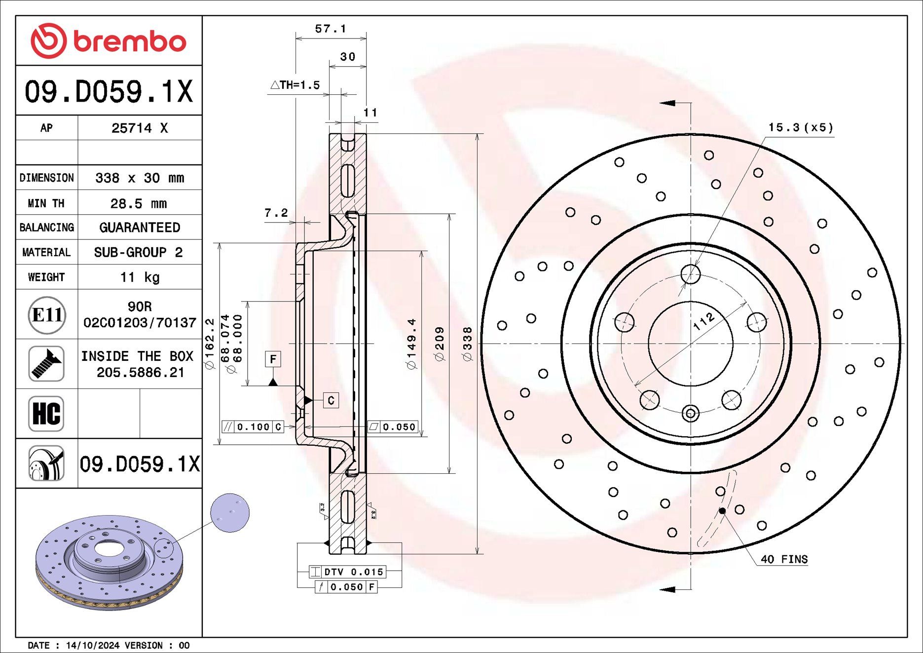 BREMBO 09.D059.1X | Ön Fren Diski Delikli-338X30 5×112 (Audi A4 16-A6 19-Q5 17 -) | 2 Adet (Fren diski)