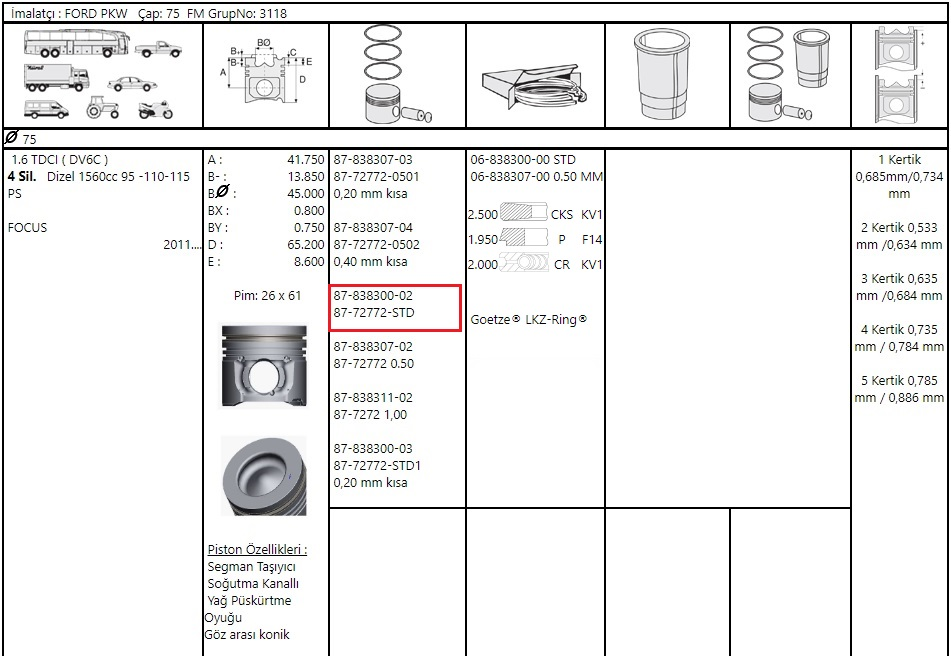 GOETZE 87-72772-STD | Focus-C-Max-Mondeo 2011-2018 Model Arası 1.6 TDCI Piston Takımı Takım