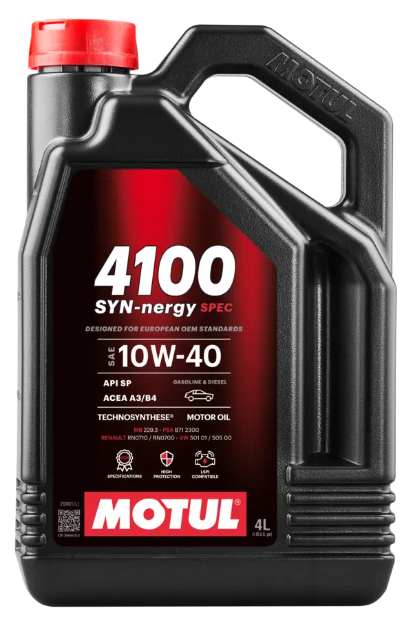 Motul 4100 Syn-Nergy Spec 10W-40, yüksek motor koruması sağlamak üzere geliştirilmiş ileri teknoloji Technosynthese® bazlı motor yağıdır. Avrupa menşeli araç üreticilerinin gereksinimlerini karşılayacak şekilde formüle edilmiştir.