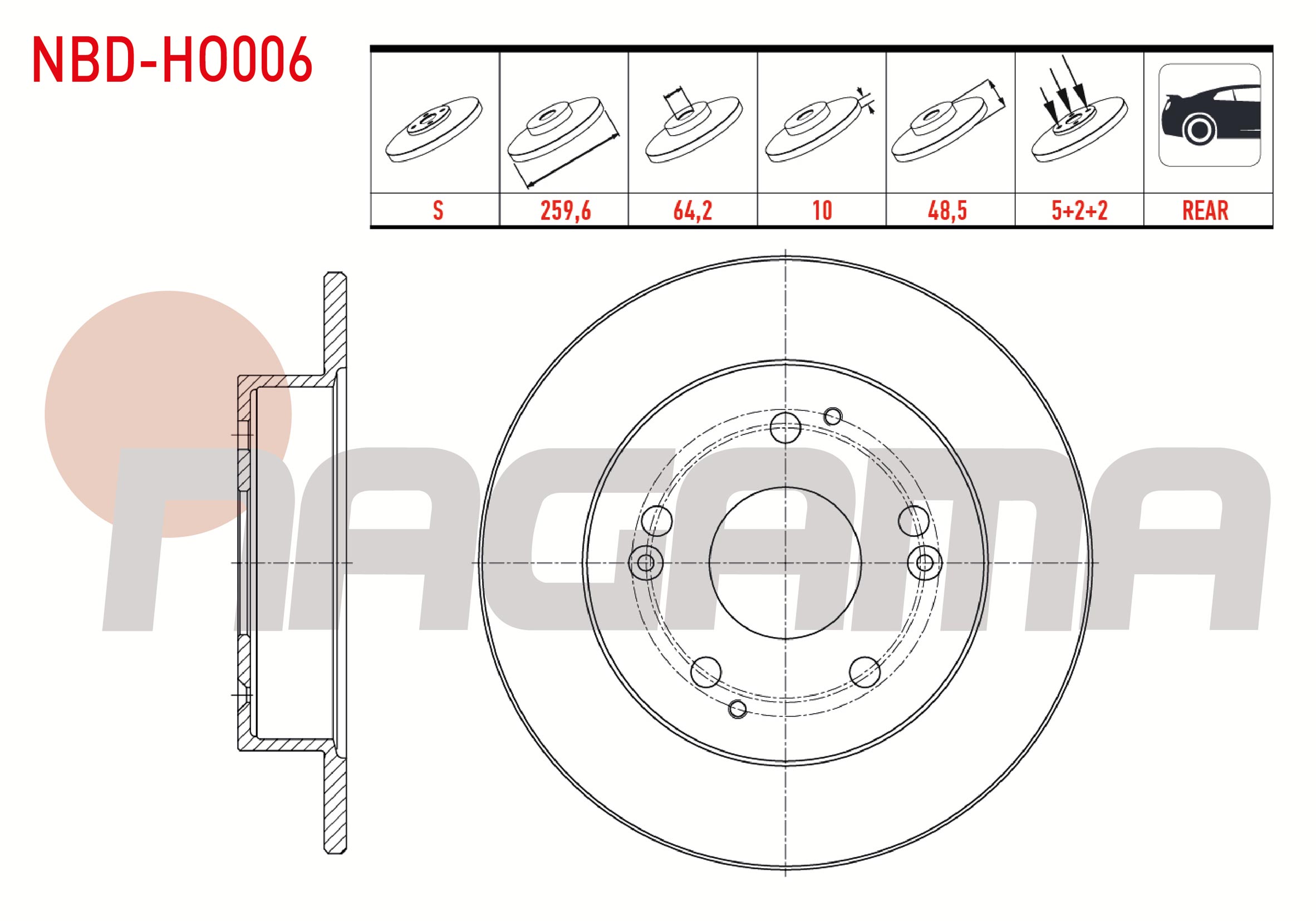 NAGAMA NBD-HO006 | Fren Diski Arka Düz 5 Bjn 259,6X10x64,2X48,5 Honda Civic VII 2.0 I-Vtec 2000-2006 / Civic VII 2.0 Type-R 2000-2006 | 2 Adet