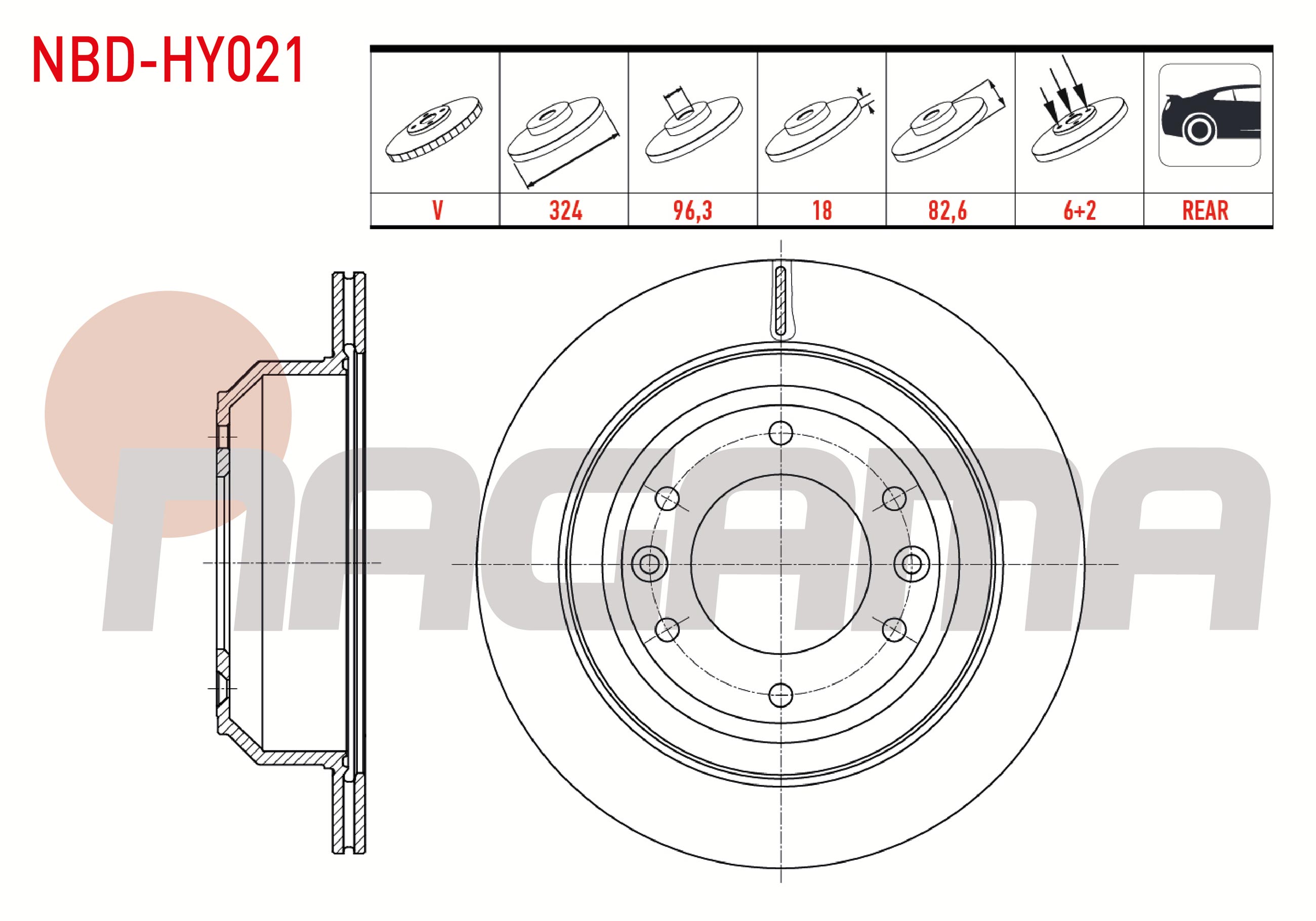 NAGAMA NBD-HY021 | Fren Diski Arka Havalı 6 Bjn 324X18x96,3X82,6 Hyundai H1 2.5 CRDI 2008-| 2 Adet