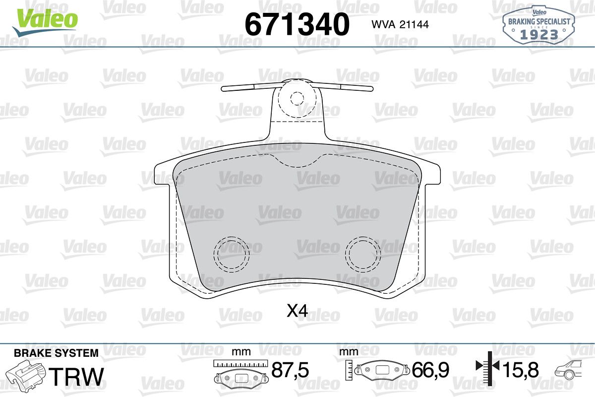 VALEO 671340 | Fren Balatası Arka-Audi A100 85-94 A4 95-97 A80 87-94 Wva 20668 Alfa Romeo 164