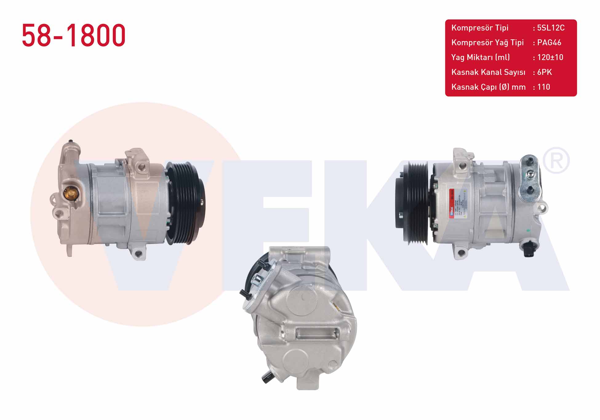 VEKA 58-1800 | Klima Kompresörü 6Pk 110mm Alfa Romeo Mıto 2013-Fiat Doblo 1.3 Mjt 2010-2015-/ Linea 1.3 Mjt 2007-/ Punto 1.3 Mjt 2012-/ Fiorino 1.3 Mtj 2007-2016-/ Opel Combo D 1.3 CDTI 2012-2016 -