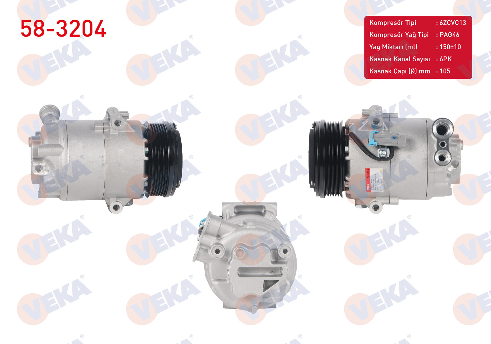 VEKA 58-3204 | Klima Kompresörü 6Pk 105mm Opel Astra H 1.3 CDTI 2004-2010