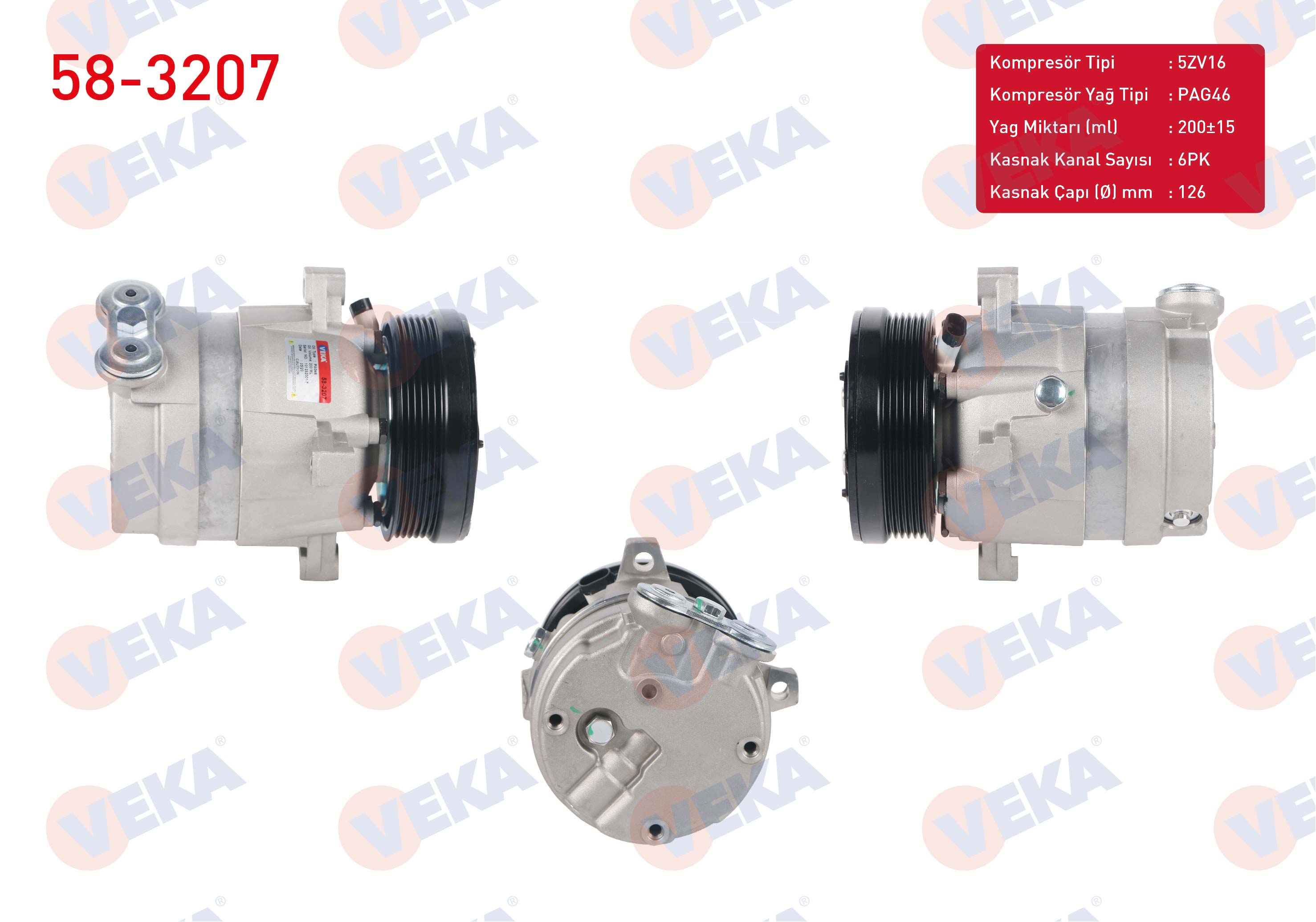 VEKA 58-3207 | Klima Kompresörü 6Pk 126mm Opel Vectra A 2.0 1988-1995 / Calıbra A 2.0İ 1995-2003