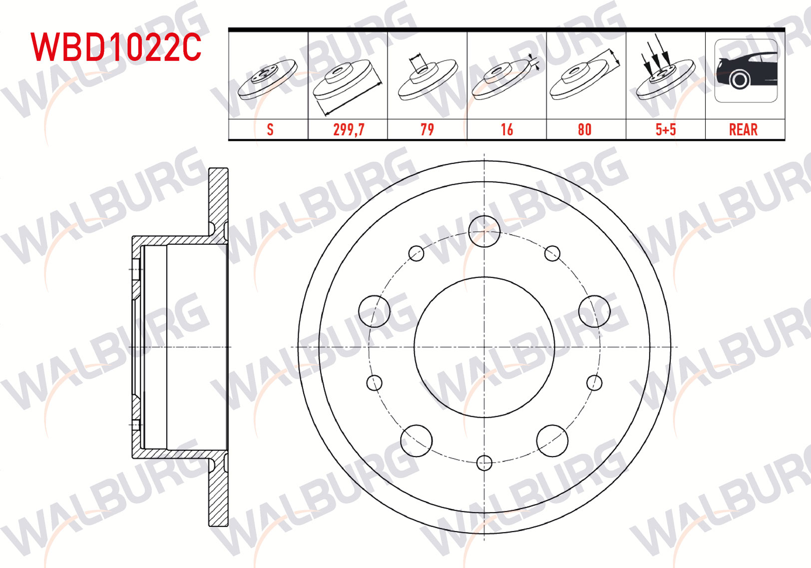 WALBURG WBD1022C | Fren Diski Arka Düz Kaplamalı 5 Bjn 16 Jant 299,7X16x79x80 Fiat Ducato 2.3 Mjt 2006-2014 / Ducato 3.0 Mjt 2006-2014 / Peugeot Boxer III 2.2 HDI 2006-2014 / Citroen Jumper III 2.8 HDI 2006-2014 | 2 Adet Takım