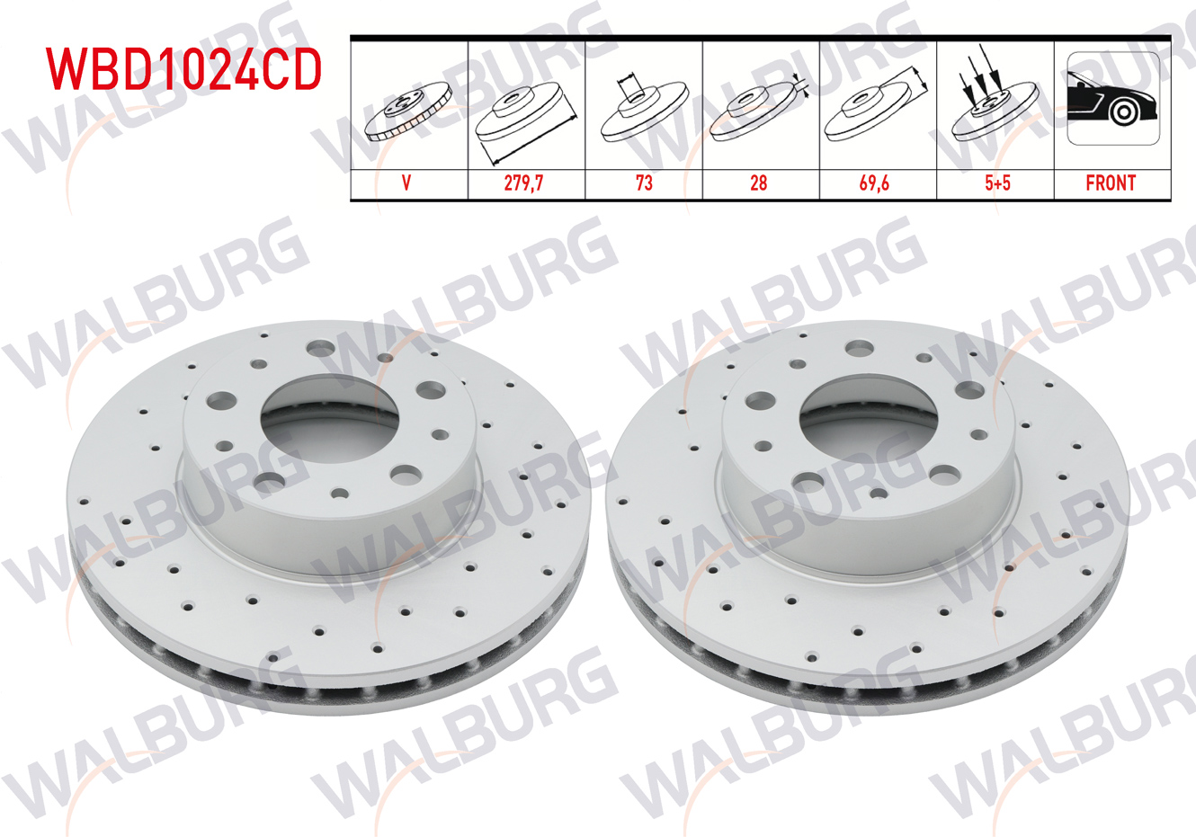 WALBURG WBD1024CD | Fren Diski Ön Havalı Kaplamalı Performans Delikli 5 Bjn 16 Jant 279,7X28x73x69,6 Fiat Ducato 2.3 Mjt 2006-2014 / Ducato 3.0 Mjt 2006-2014 / Peugeot Boxer III 2.2 HDI 2006-2014 / Citroen Jumper III 2.2 HDI | 2 Adet