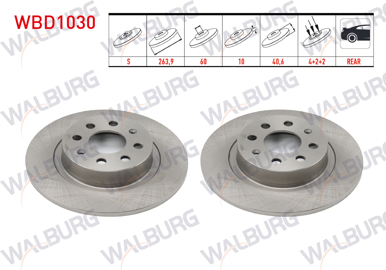 WALBURG WBD1030 | Fren Diski Arka Düz 4 Bjn 263,9X10x60x40,6 Fiat G.Punto 1.3 Mjt-1.9 Mjt 2005-2012 / Punto Evo 1.3 Mjt-1.4 2009-2012 / Linea 1.4 T-Jet 2007-/ Opel Corsa E 1.2-1.4 2014-| 2 Adet