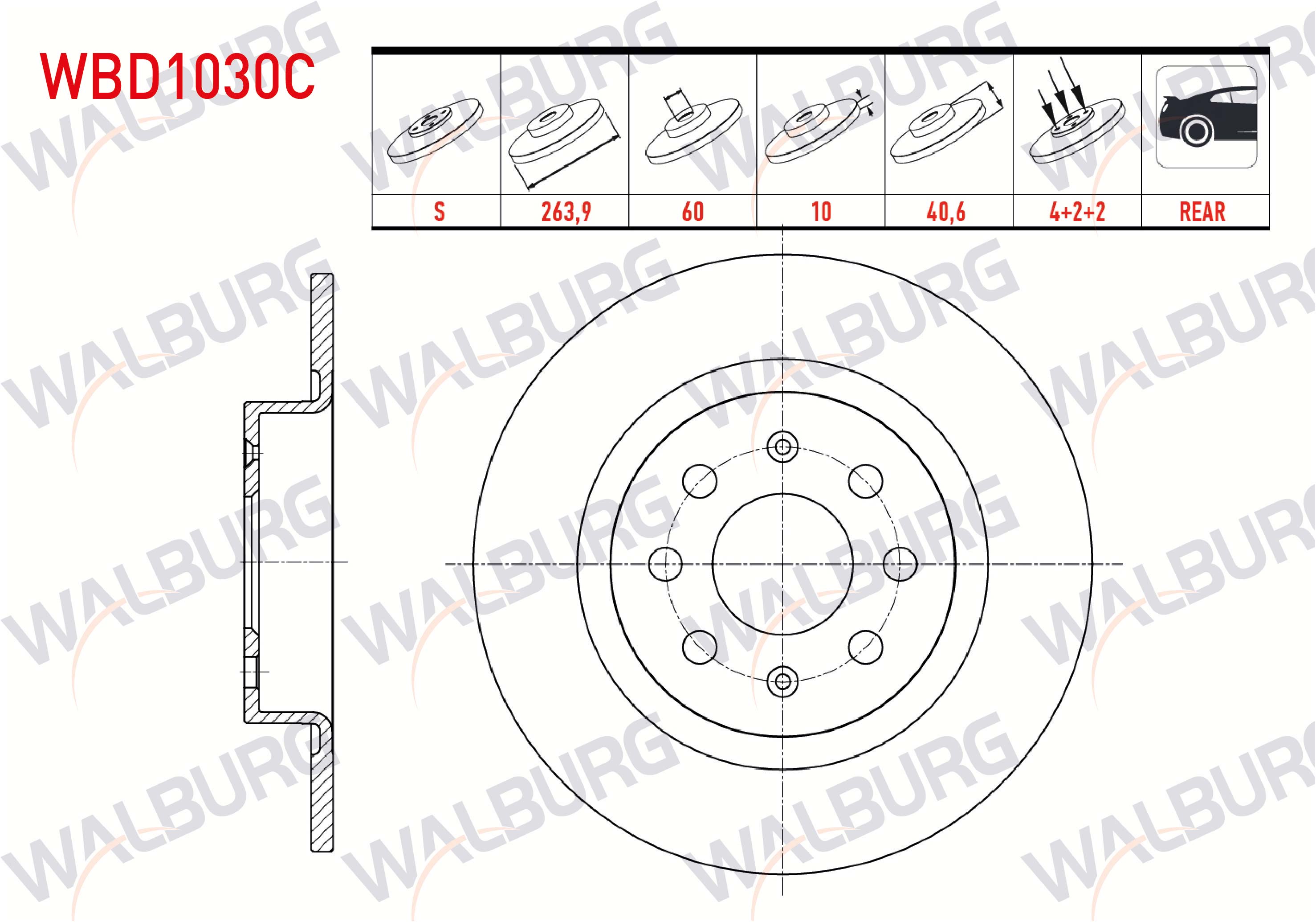 WALBURG WBD1030C | Fren Diski Arka Düz Kaplamalı 4 Bjn 263,9X10x60x40,6 Fiat G.Punto 1.3 Mjt-1.9 Mjt 2005-2012 / Punto Evo 1.3 Mjt-1.4 2009-2012 / Linea 1.4 T-Jet 2007-/ Opel Corsa E 1.2-1.4 2014-| 2 Adet