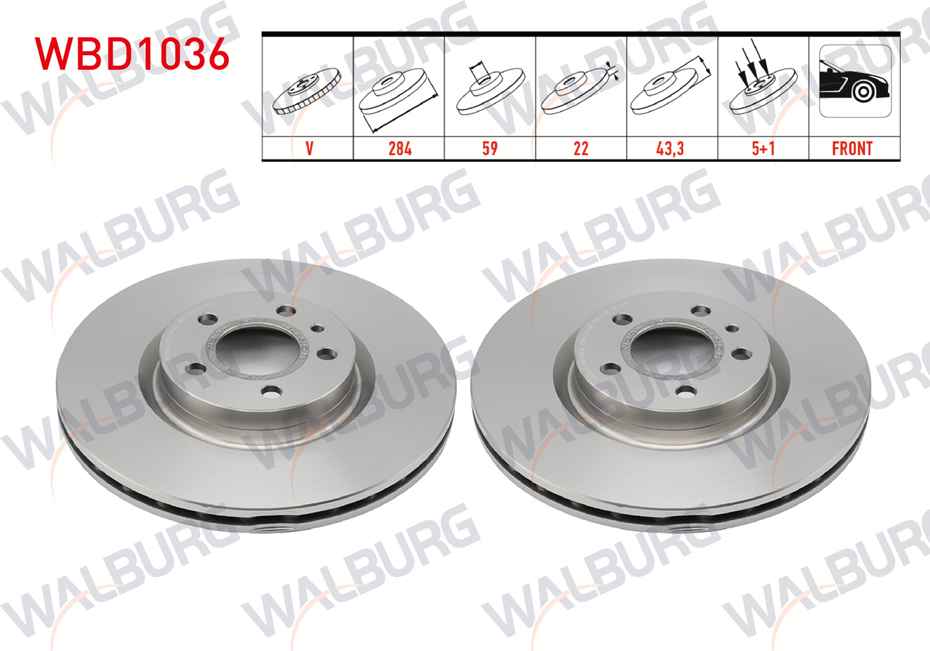 WALBURG WBD1036 | Fren Diski Ön Havalı 5 Bjn 284X22x59x43,3 Fiat Egea 1.3 Mjt-1.6 Mjt-1.4 16V-1.6 16V 2015-/ 500L 1.6 Mjt-0.9-1.4 2012-/ Egea Hb 1.6 D 2020-/ Egea Cross 1.6 2020-| 2 Adet