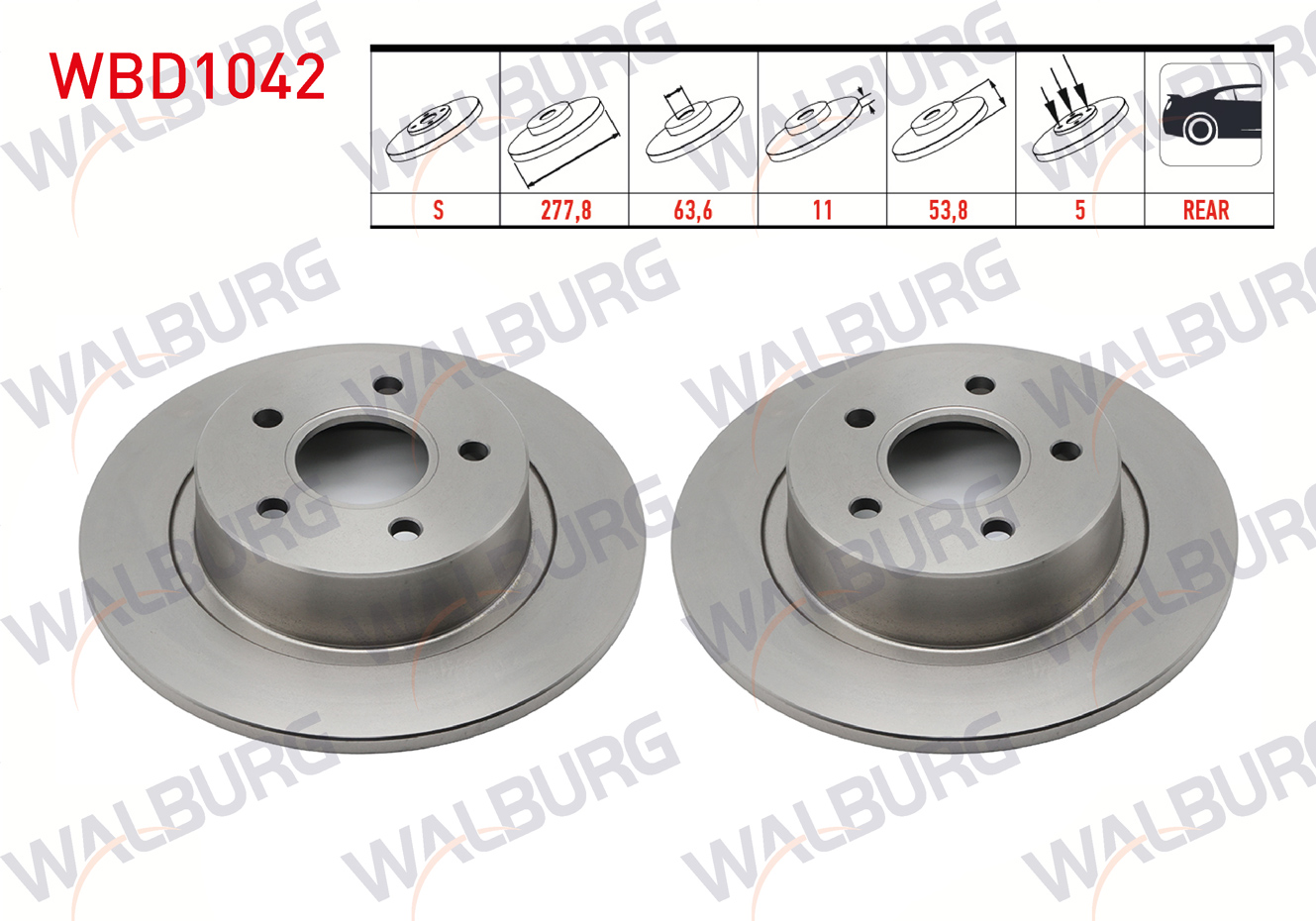 WALBURG WBD1042 | Fren Diski Arka Düz 5 Bjn 277,8X11x63,7X53,8 Ford Transit Connect 1.8 TDCI 2002-2013 / Ford Tourneo Connect 1.8 TDCI 5 2002-2013 | 2 Adet