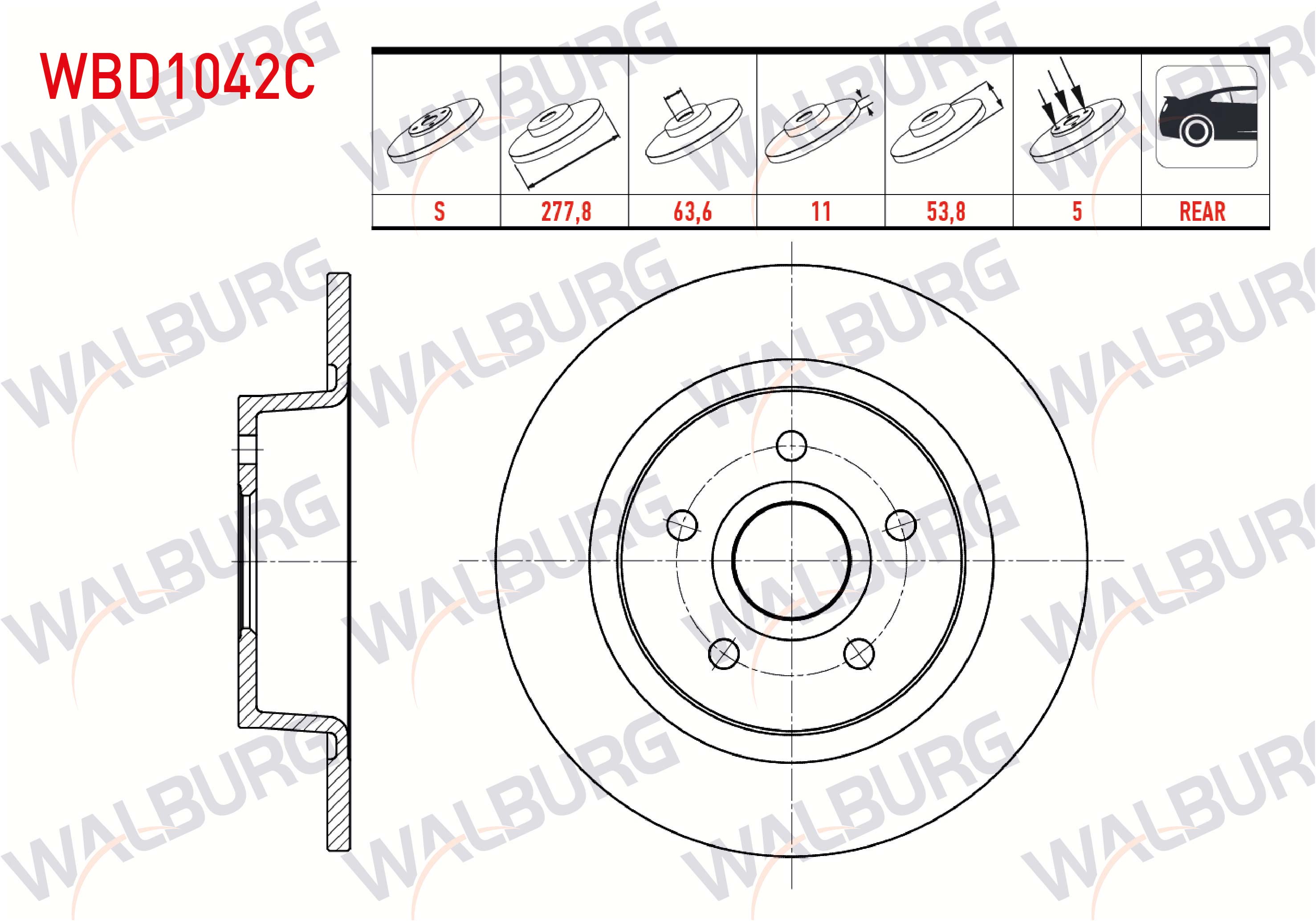 WALBURG WBD1042C | Fren Diski Arka Düz Kaplamalı 5 Bjn 277,8X11x63,7X53,8 Ford Transit Connect 1.8 TDCI 2002-2013 / Ford Tourneo Connect 1.8 TDCI 5 2002-2013 | 2 Adet Takım