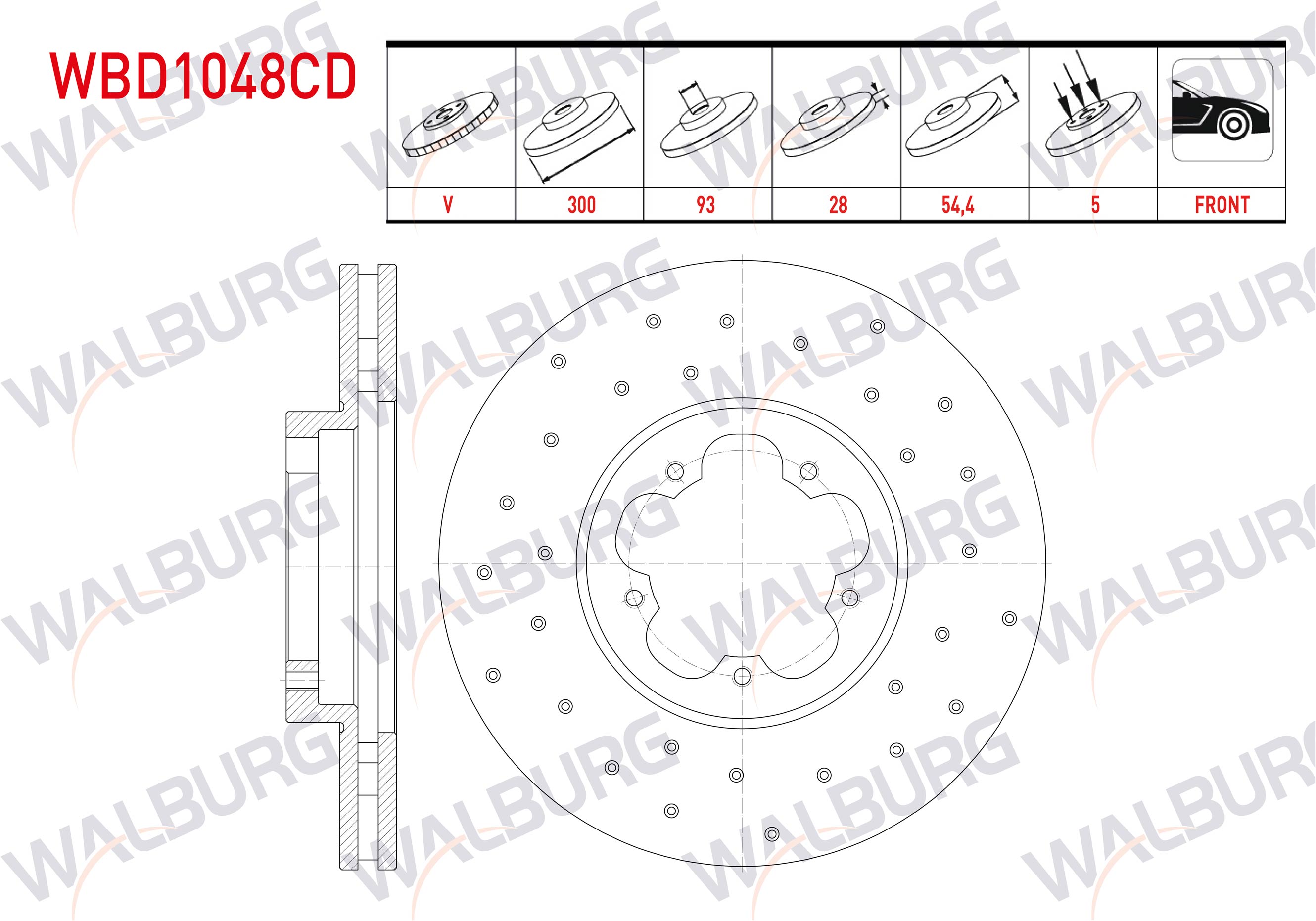 WALBURG WBD1048CD | Fren Diski Ön Havalı Kaplamalı Performans Delikli 5 Bjn 300X28x93x54,4 Ford Transit 2.2 TDCI Arkadan Itıs 2006-2014 / Transit 2.4 TDCI 2006-2014 / Transit 2.2 TDCI 2006-2014 / Transit 3.2 TDCI 2006-2014 | 2 Adet Takım