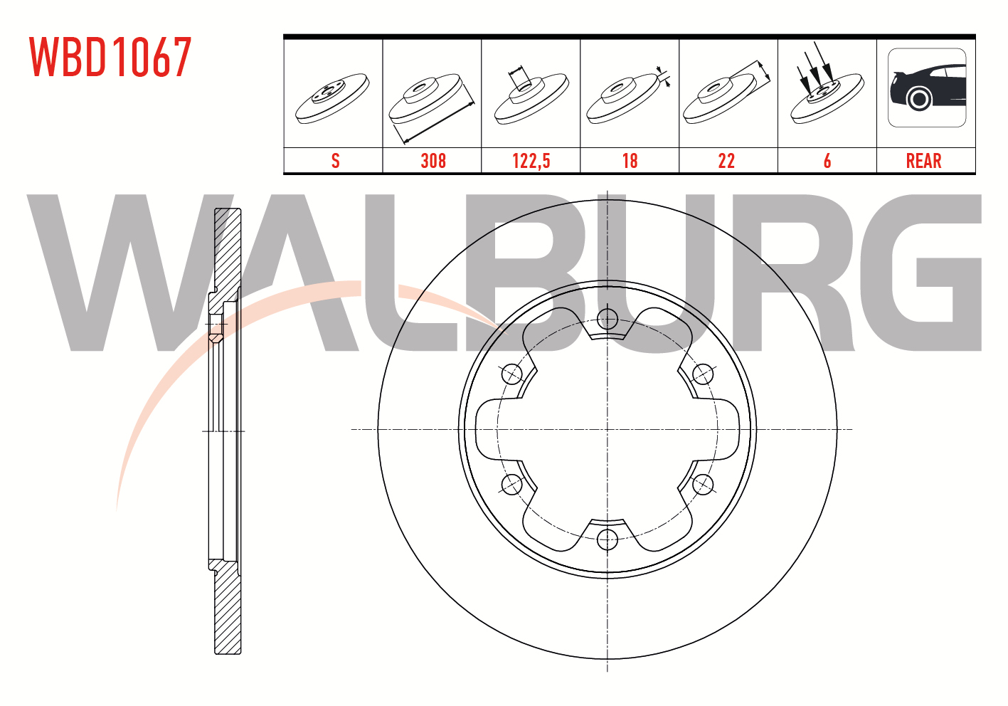 WALBURG WBD1067 | Fren Diski Arka Düz 6 Bjn 308X18x122,5X22 Ford Transit (V363) 2.2 TDCI Çift Teker 2014-| 2 Adet
