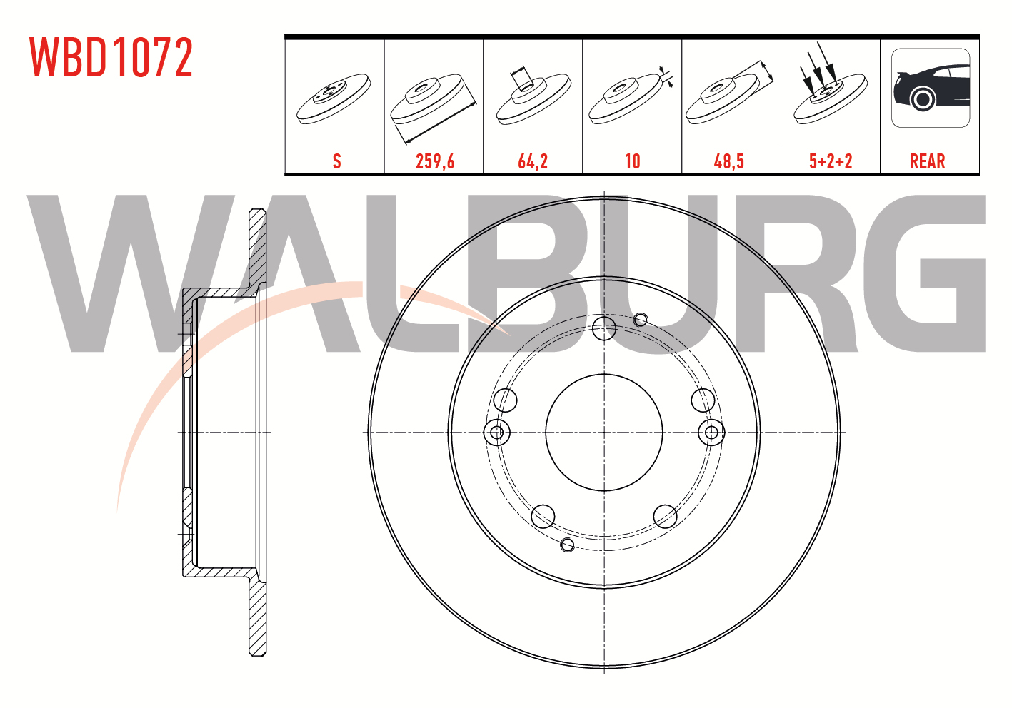 WALBURG WBD1072 | Fren Diski Arka Düz 5 Bjn 259,6X10x64,2X48,5 Honda Civic VII 2.0 I-Vtec 2000-2006 / Civic VII 2.0 Type-R 2000-2006 | 2 Adet