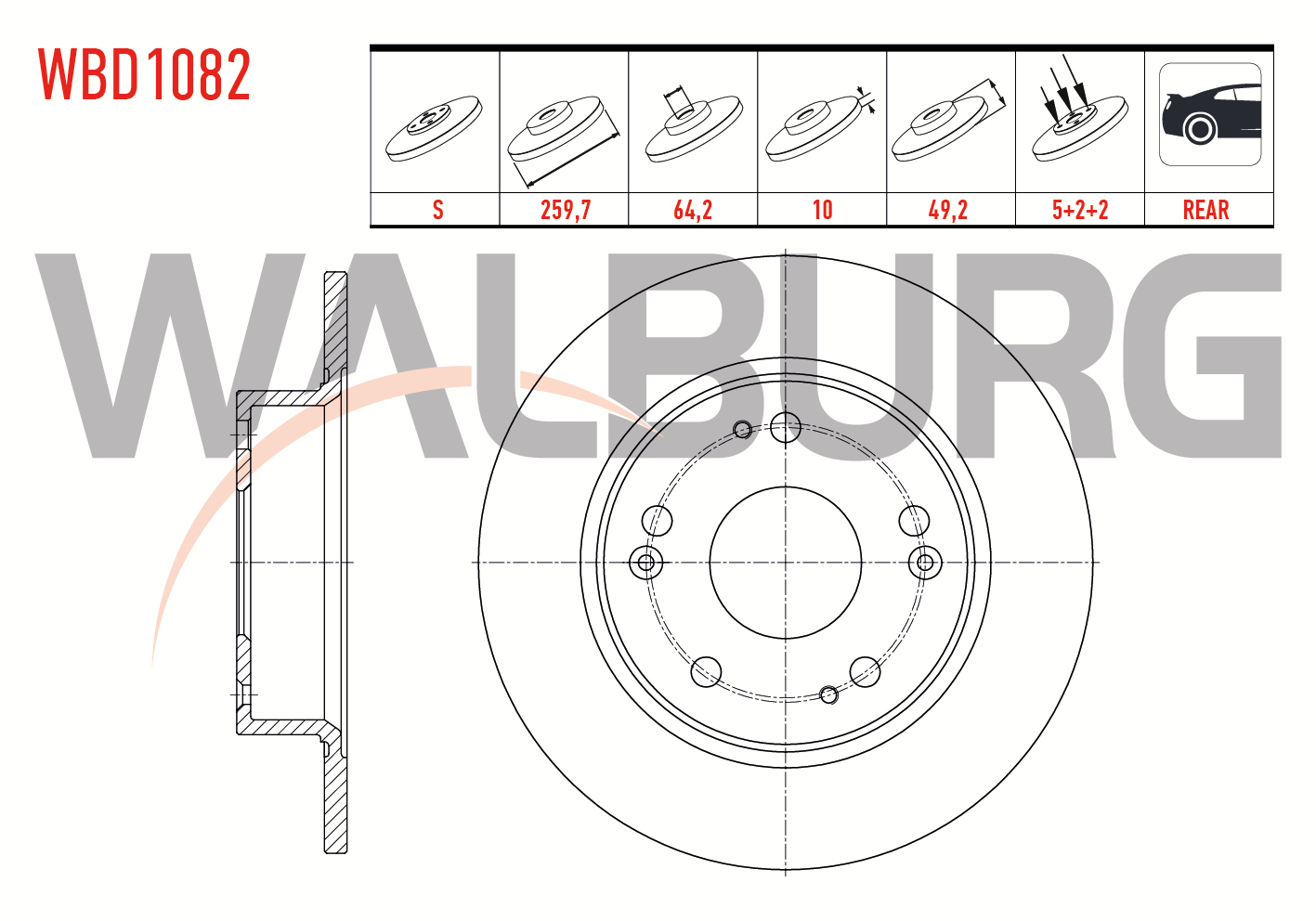 WALBURG WBD1082 | Fren Diski Arka Düz 5 Bjn 259,7X10x64,2X48,6 Honda Accord VIII (Cu) 2.0 I-Vtec 2008-/ Accord VIII (Cu) 2.2 I- CDTI 2008 / Accord VIII (Cu) 2.4 I-Vtec 2008-| 2 Adet