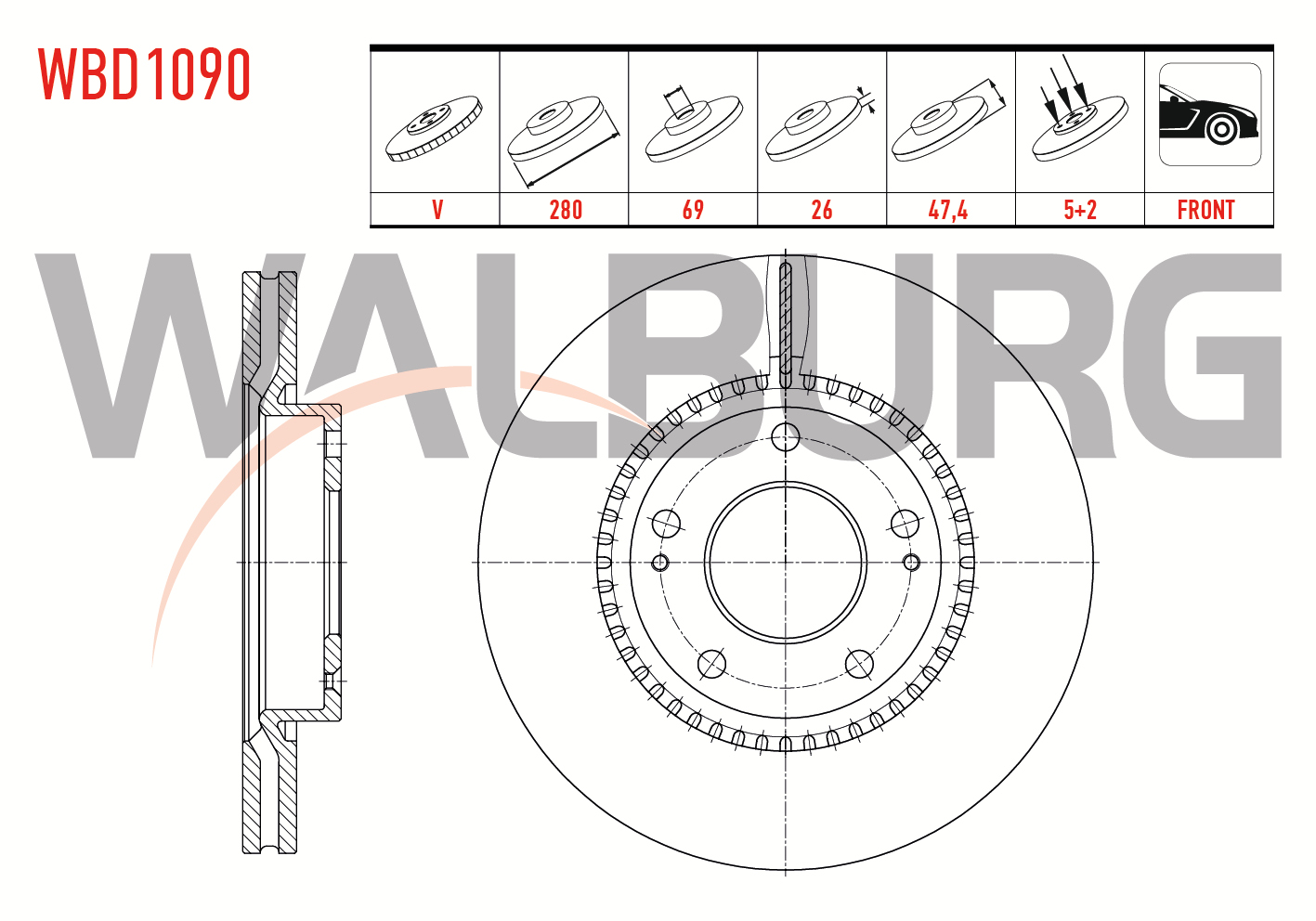 WALBURG WBD1090 | Fren Diski Ön Havalı 5 Bjn 280X26x69x47,4 Hyundai i30 (Fd) 1.4İ-1.6İ 2007-2011 / Ix20 (Jc) 1.4İ-1.4 CRDI-1.6İ 2010-/ Kia Ceed 1.6 CRDI-1.4İ-1.6İ 2006-2012 / Sportage (Je) 2.0 CRDI 2004-2010 | 2 Adet Takım