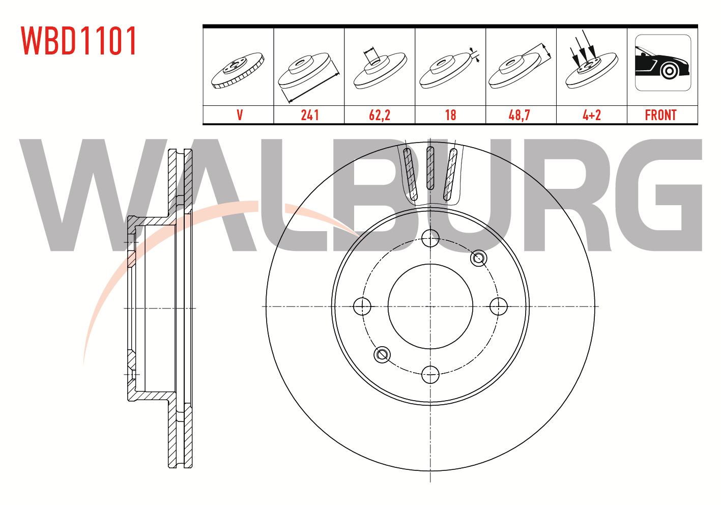 WALBURG WBD1101 | Fren Diski Ön Havalı 4 Bjn 241X18x62,2X48,7 Hyundai i10 1.1İ 12V-1.0 D-Cvvt-1.2 D-Cvvt 13 Jant 2008-2013 / Kia Picanto (Ba) 1.25-1.1İ 4 Bjn 2004-2011 | 2 Adet