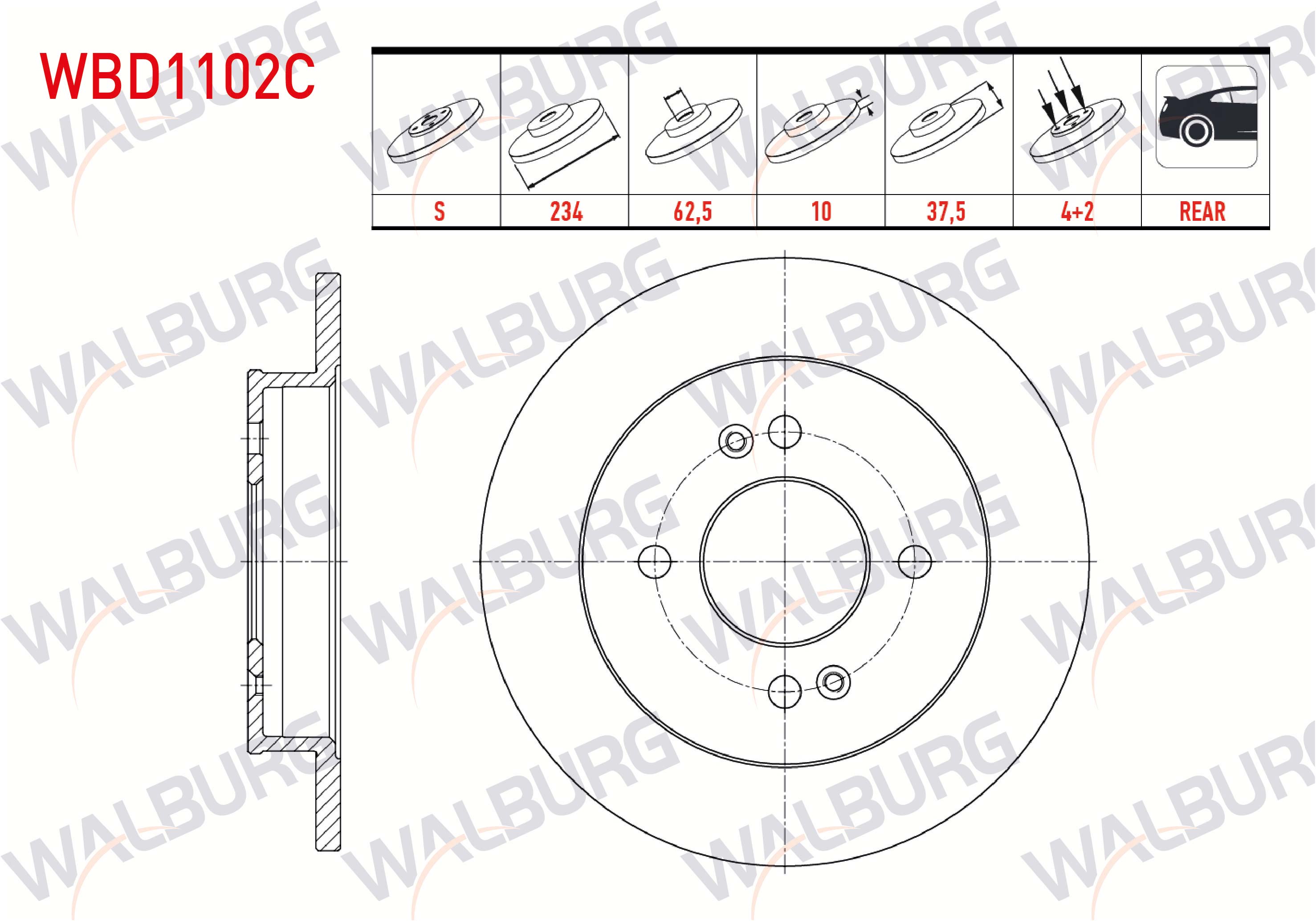 WALBURG WBD1102C | Fren Diski Arka Düz Kaplamalı 4 Bjn 234X10x62,5X37,5 Hyundai i10 1.1İ 12V-1.0 D-Cvvt-1.2 D-Cvvt 13 Jant 2008-2013 / Kia Picanto (Ba) 1.25-1.1İ 4 Bjn 2004-2011 | 2 Adet