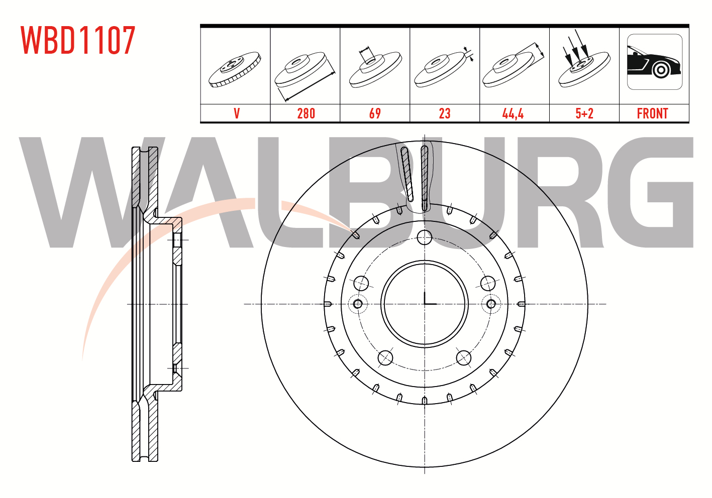 WALBURG WBD1107 | Fren Diski Ön Havalı 5 Bjn 280X23x69x44,5 Hyundai Elantra 1.6 D-Cvvt-1.6 CRDI 2011-2015 / Elantra 1.6 CRDI-1.6 D-Cvvt 2015-/ Kia Ceed 1.6 Cvvt-1.6 GDI 2012-| 2 Adet