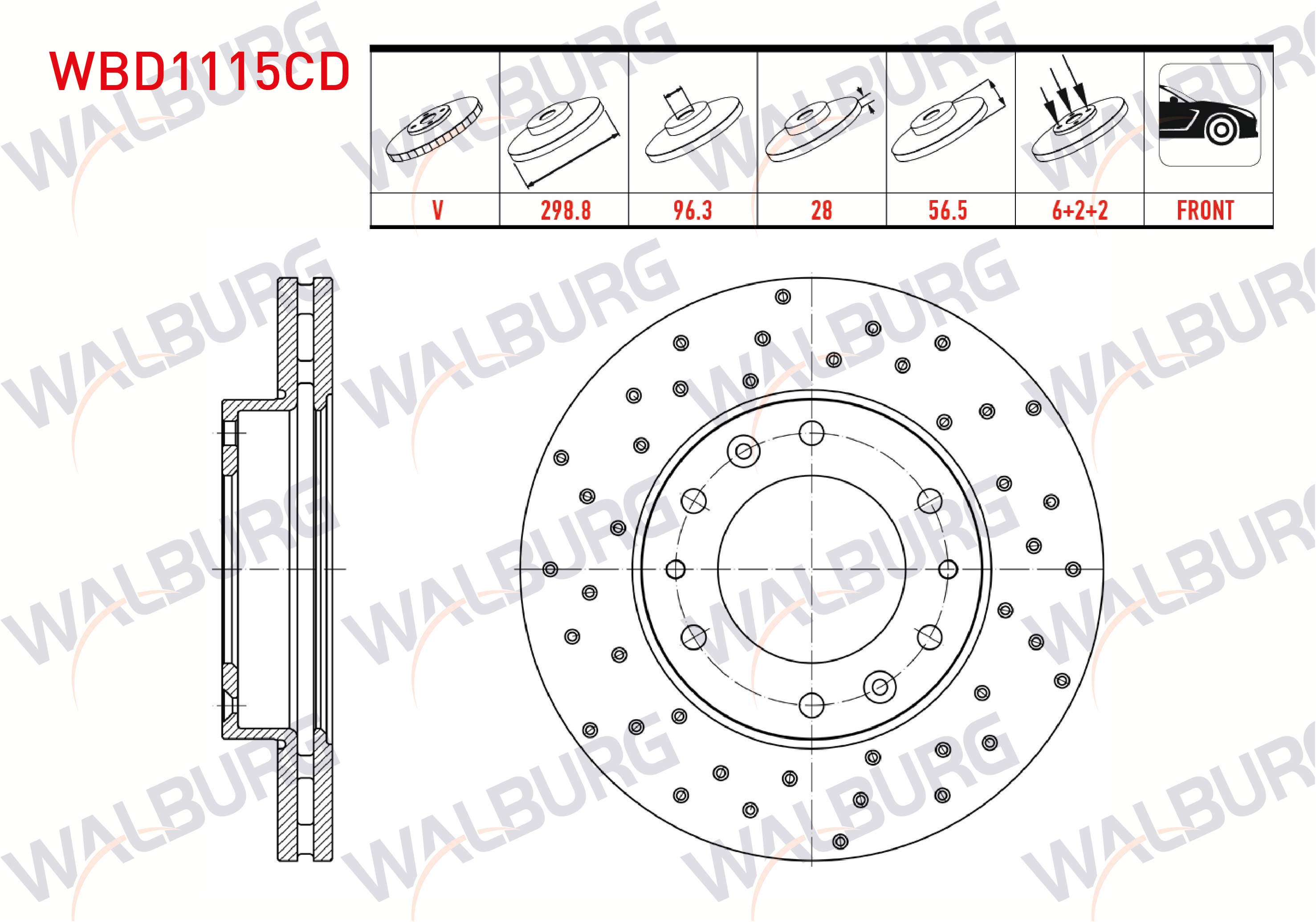 WALBURG WBD1115CD | Fren Diski Ön Havalı Kaplamalı Performans Delikli 6 Bjn 298,8X28x96,3X56,5 Hyundai H350 2.5 CRDI 2015-| 2 Adet