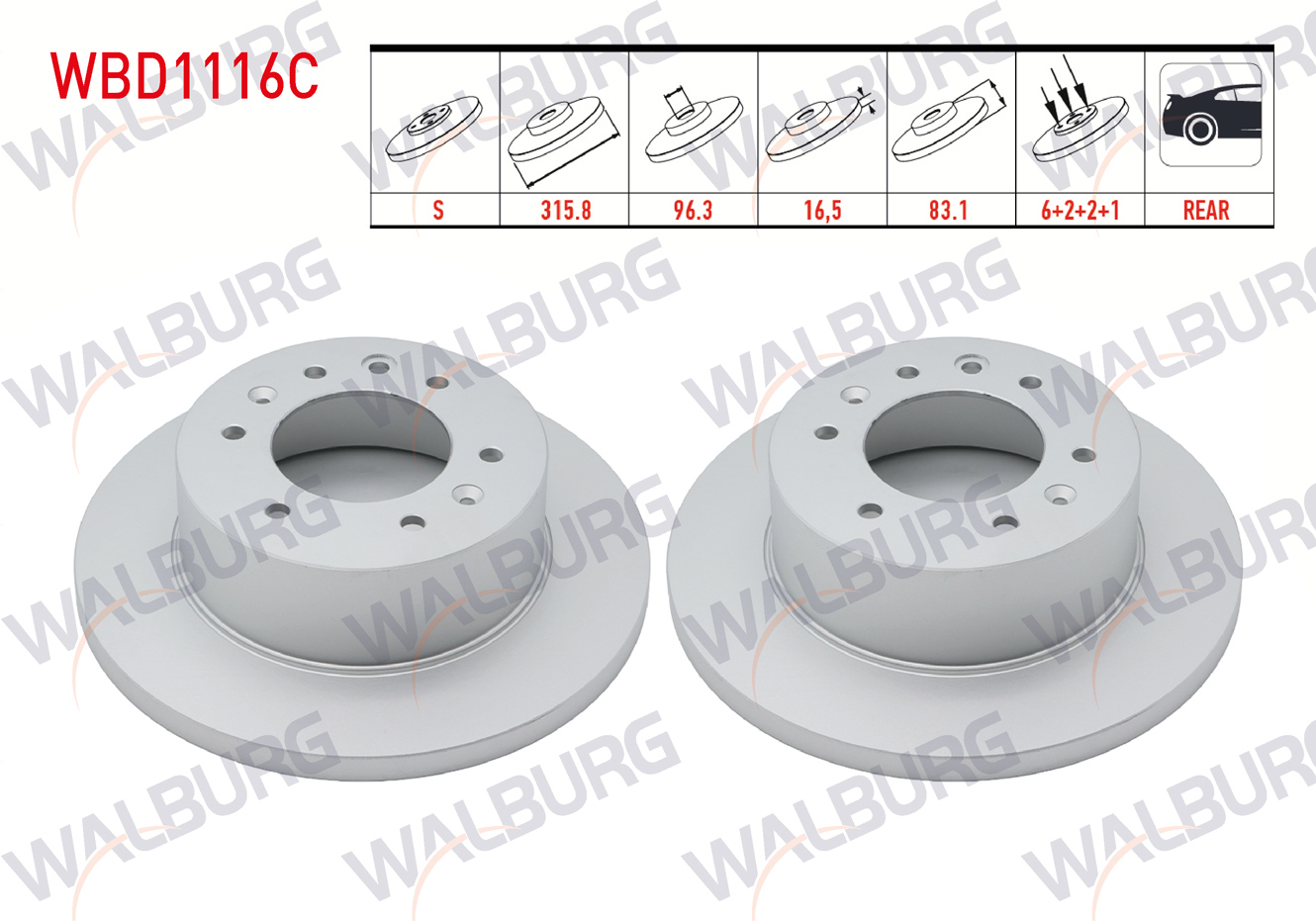 WALBURG WBD1116C | Fren Diski Arka Düz Kaplamalı 6 Bjn 315,8X16,5X96,3X83,1 Hyundai H350 2.5 CRDI 2015-| 2 Adet