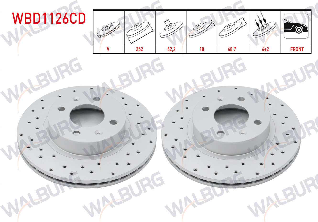 WALBURG WBD1126CD | Fren Diski Ön Havalı Kaplamalı Performans Delikli 4 Bjn 252X18x62,2X48,7 Hyundai i10 (Ba) 1.2 D-Cvvt 14 Jant 2013-/ i10 (Pa) 1.1İ 12V 2008-2013 / i10 (Ba) 1.0 D-Cvvt 2013-/ Picanto (Ba) 1.25 2004-2011 | 2 Adet Takım