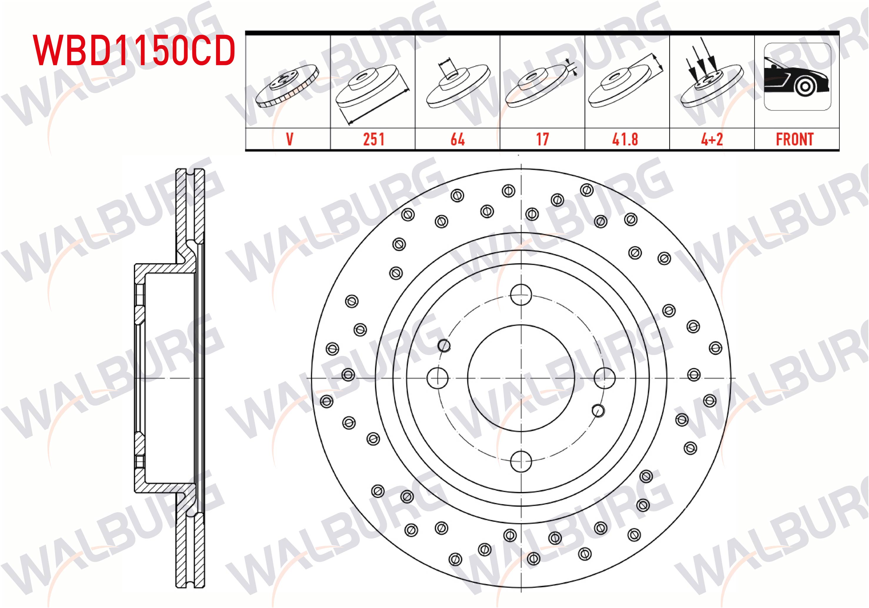 WALBURG WBD1150CD | Fren Diski Ön Havalı Kaplamalı Performans Delikli 4 Bjn 251X17x64x41,8 Mitsubishi Attrage (A10_) 1.2 2014-/ Space Star VI (A0_A) 1.2 2012-| 2 Adet Takım