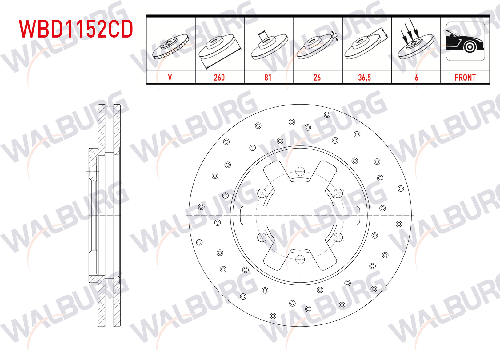 WALBURG WBD1152CD | Fren Diski Ön Havalı Kaplamalı Performans Delikli 6 Bjn 260X26x81x36,5 Nissan Pick Up (D22) 2.5 D 4X4 1998-/ Pick Up (D22) 2.5 Dı 4X4 1998-| 2 Adet Takım