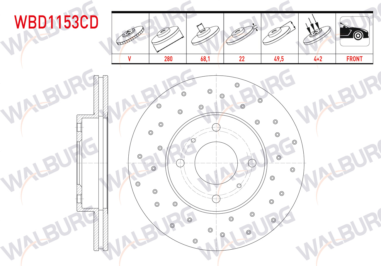 WALBURG WBD1153CD | Fren Diski Ön Havalı Kaplamalı Performans Delikli 4 Bjn 280X22x68,1X49,5 Nissan Primera 1.6İ 16V-1.8İ 16V-2.0İ 16V-2.0 TD 1996-2001 / Almera II 1.5İ 16V-1.8İ 2000-2007 / 200 Sx 1.8 1988-1994 | 2 Adet