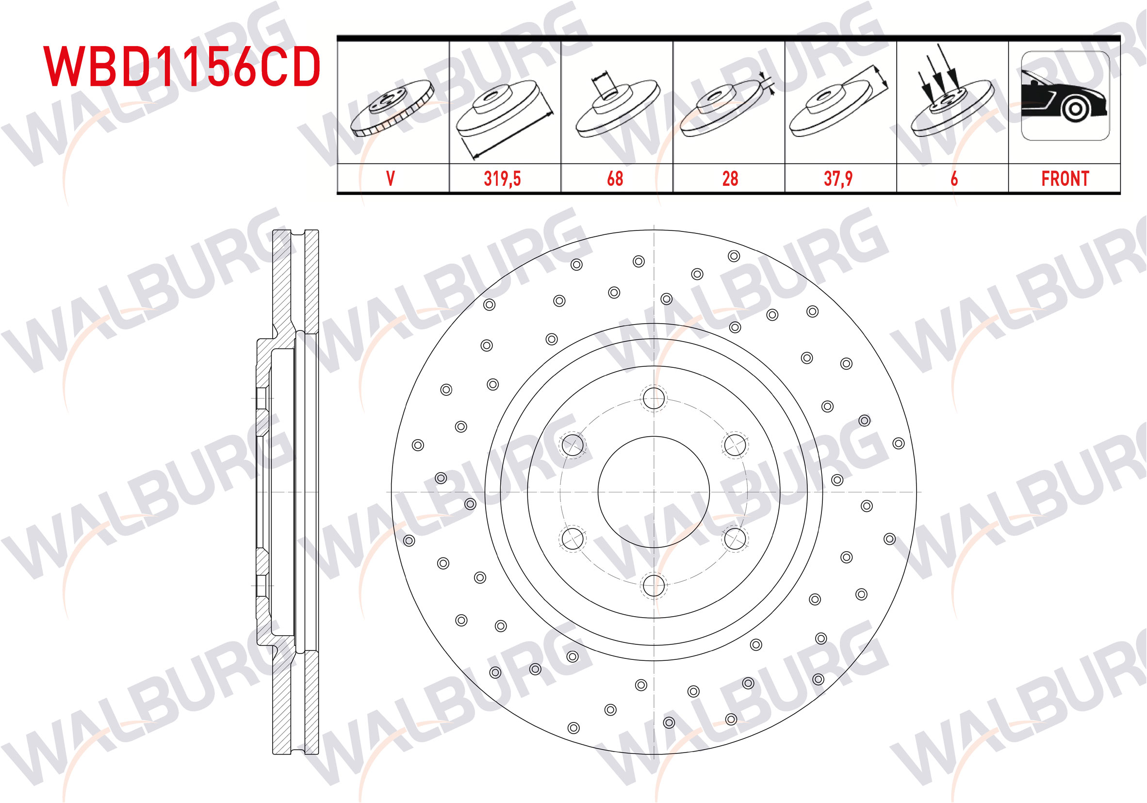 WALBURG WBD1156CD | Fren Diski Ön Havalı Kaplamalı Performans Delikli 6 Bjn 319,5X28x68x37,9 Nissan Pathfinder (R51) 2.5 DCI 4X4 2005-/ Navara (D40) 2.5 DCI 6 Bjn 4X4 2005-2015 | 2 Adet