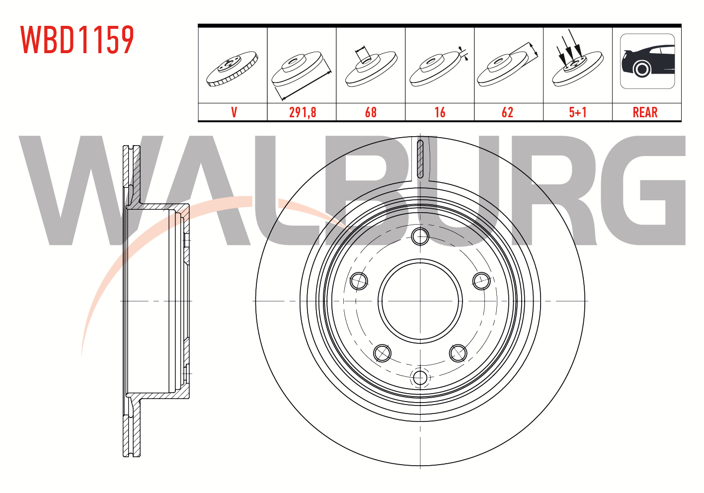 WALBURG WBD1159 | Fren Diski Arka Havalı 5 Bjn 291,8X16x68x62 Nissan X-Traıl 2.0İ 2007-2013 / X-Traıl 2.0 DCI 2007-2013 / Qashqai + 2 1.5 DCI 2007-2014 / Qashqai + 2 2.0 DCI 2007-2014 / Renault Koleos 2.0 DCI 2008-2014 | 2 Adet