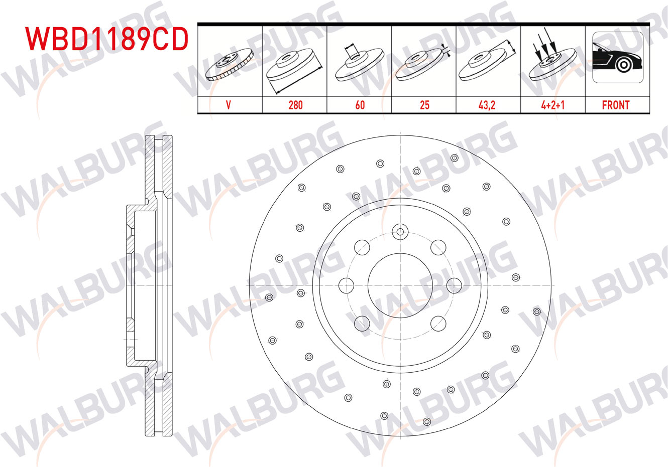 WALBURG WBD1189CD | Fren Diski Ön Havalı Kaplamalı Performans Delikli 4 Bjn 280X25x60x42,2 Opel Combo C 1.3 CDTI-1.7 CDTI-2001-2006 / Meriva A 1.6-1.3 CDTI 2003-2010 / Astra H 1.4İ-1.6İ-1.3 CDTI 2004-2010 | 2 Adet