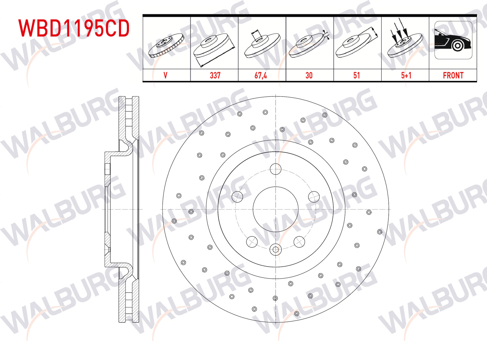 WALBURG WBD1195CD | Fren Diski Ön Havalı Kaplamalı Performans Delikli 5 Bjn 337X30x67,4X51 Opel Insignia 1.6-1.6 T-2.0 CDTI-2.0 T 18 Jant 2008-| 2 Adet Takım