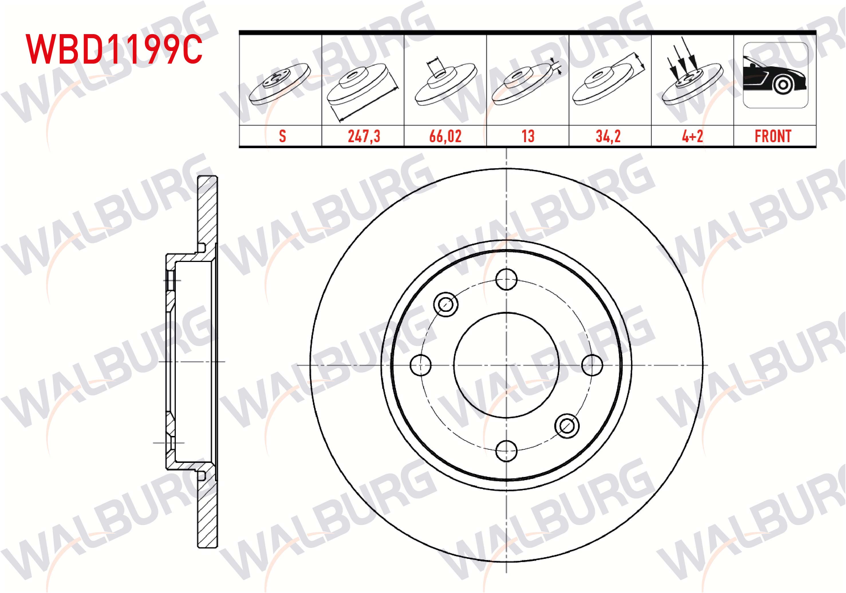WALBURG WBD1199C | Fren Diski Ön Düz Kaplamalı 4 Bjn 247,3X13x66,02X34,2 206 (2A / C) 1.4 HDI-1.4İ 16V 1998-2006 / Xsara 1.4 1997-2005 / Xsara 1.6 1997-2005 / Xsara 1.8 1997-2005 / 306 1.4İ 1993-2002 / 306 1.6İ 1993-2002 | 2 Adet Takım
