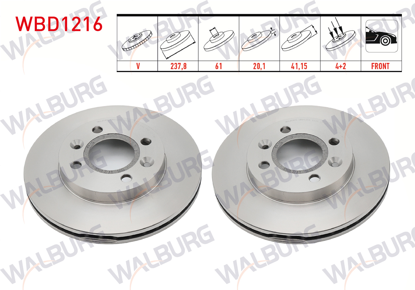 WALBURG WBD1216 | Fren Diski Ön Havalı 4 Bjn 237,8X20,1X61x41,15 Kangoo 1.5 DCI 1998-2008 / Clio II 1.2İ-1.4İ-1.6İ 1998-2005 / Symbol II 1.4-1.5 DCI 2008-2012 / Megane I 1.4 16V 1996-2003 / R 19 1.6 1998-2008 | 2 Adet Takım