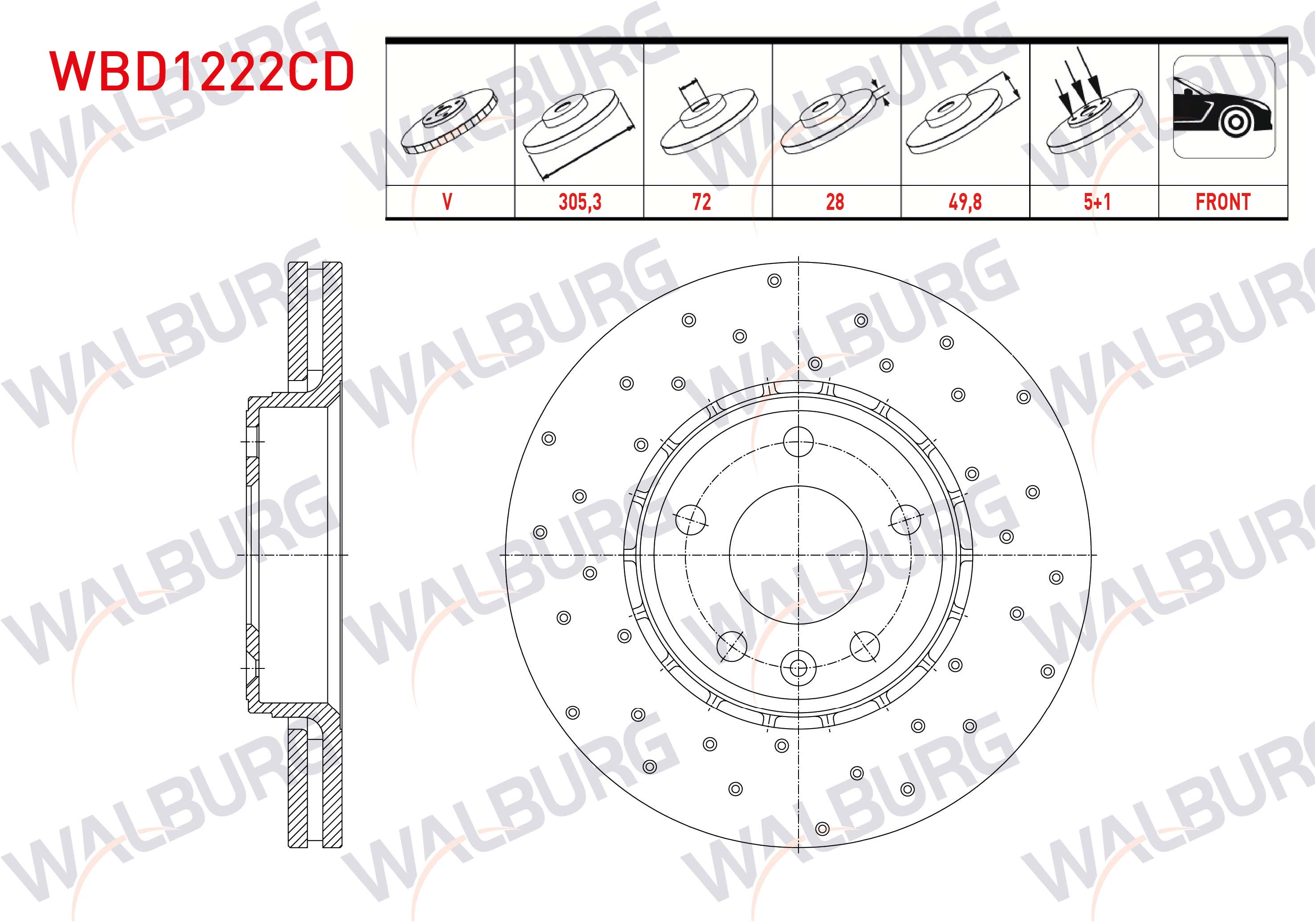 WALBURG WBD1222CD | Fren Diski Ön Havalı Kaplamalı Performans Delikli 5 Bjn 305,3X28x72x49,8 Renault Traffic II 1.9 DCI-2.0 DCI 2001-2014 / Opel Vivaro (J7) 1.9 Dtı 2002-2014 / Vivaro (X83) 2.0 CDTI 2015-| 2 Adet Takım