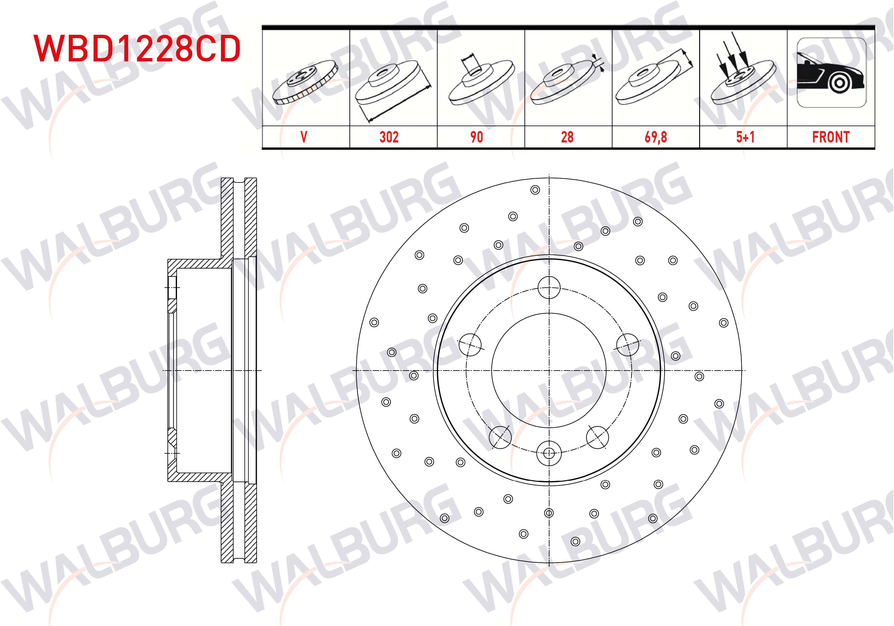 WALBURG WBD1228CD | Fren Diski Ön Havalı Kaplamalı Performans Delikli 5 Bjn 302X28x90x69,8 Renault Master III (Fv) 2.3 DCI 2010-/ Master III (Fv) 2.5 DCI 2010-| 2 Adet Takım