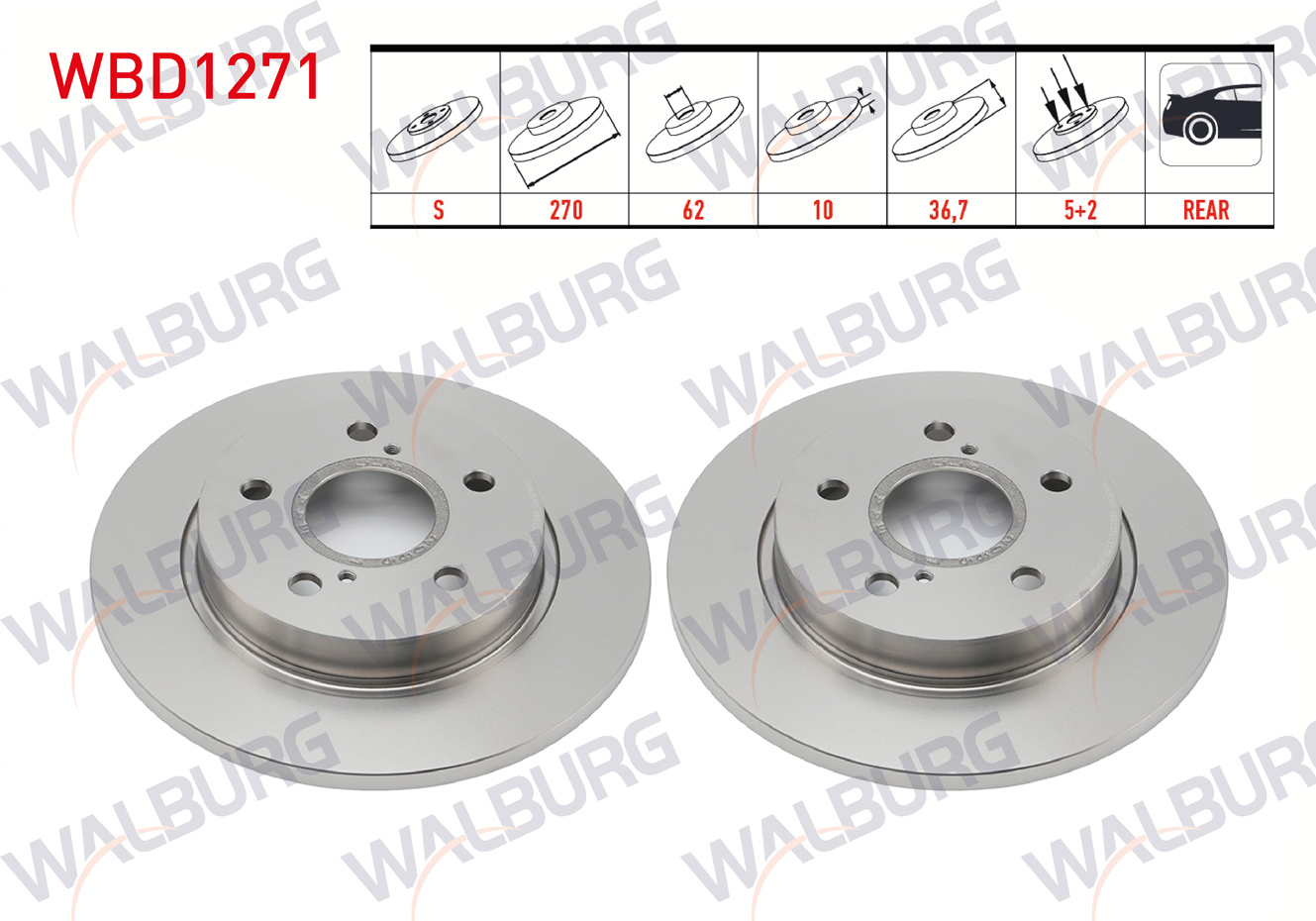 WALBURG WBD1271 | Fren Diski Arka Düz 5 Bjn 270X10x62x36,7 Corolla 1.4 D-4D-1.33 2007-2012 / Auris 1.33 Dual-Vvt-I 2007-2012 / Auris 1.4 D-4D 2007-2012 / Auris 1.33 2012-/ Auris 1.4 D-4D 2012-/ Auris 1.6-1.8 Hybrıd 2012-| 2 Adet