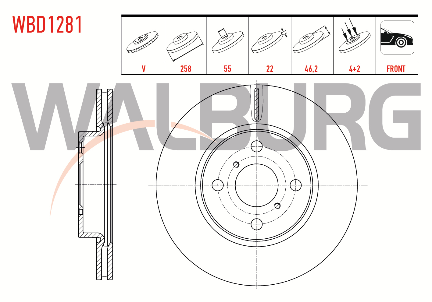 WALBURG WBD1281 | Fren Diski Ön Havalı 4 Bjn 258X22x55x46,2 Toyota Yaris 1.0 Vvt-I 2006-2010 / Yaris 1.3 Vvt-I 2006-2010 / Yaris 1.33 Vvt-I 2006-2010 / Yaris 1.4 D-4D 2006-2010 | 2 Adet Takım