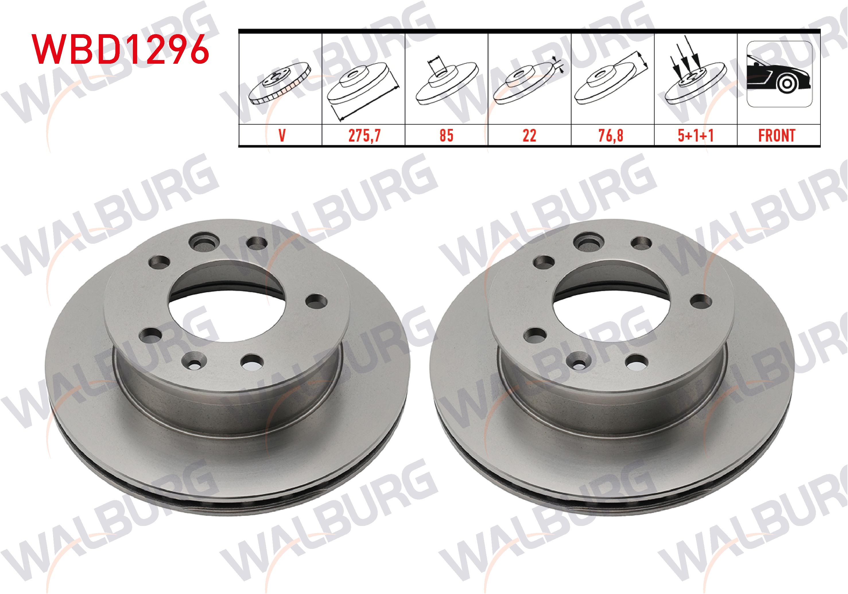 WALBURG WBD1296 | Fren Diski Ön Havalı 5 Bjn 275,7X22x85x76,8 Volkswagen Lt 28-35 II 2.5 TDI-2.8 TDI 1996-2006 / Lt 28-46 II 2.5 TDI 1996-2006 / Sprinter 2T 208D-210D 1995-2006 / Sprinter 3,5T 313-315-316 CDI 2006-2009 | 2 Adet