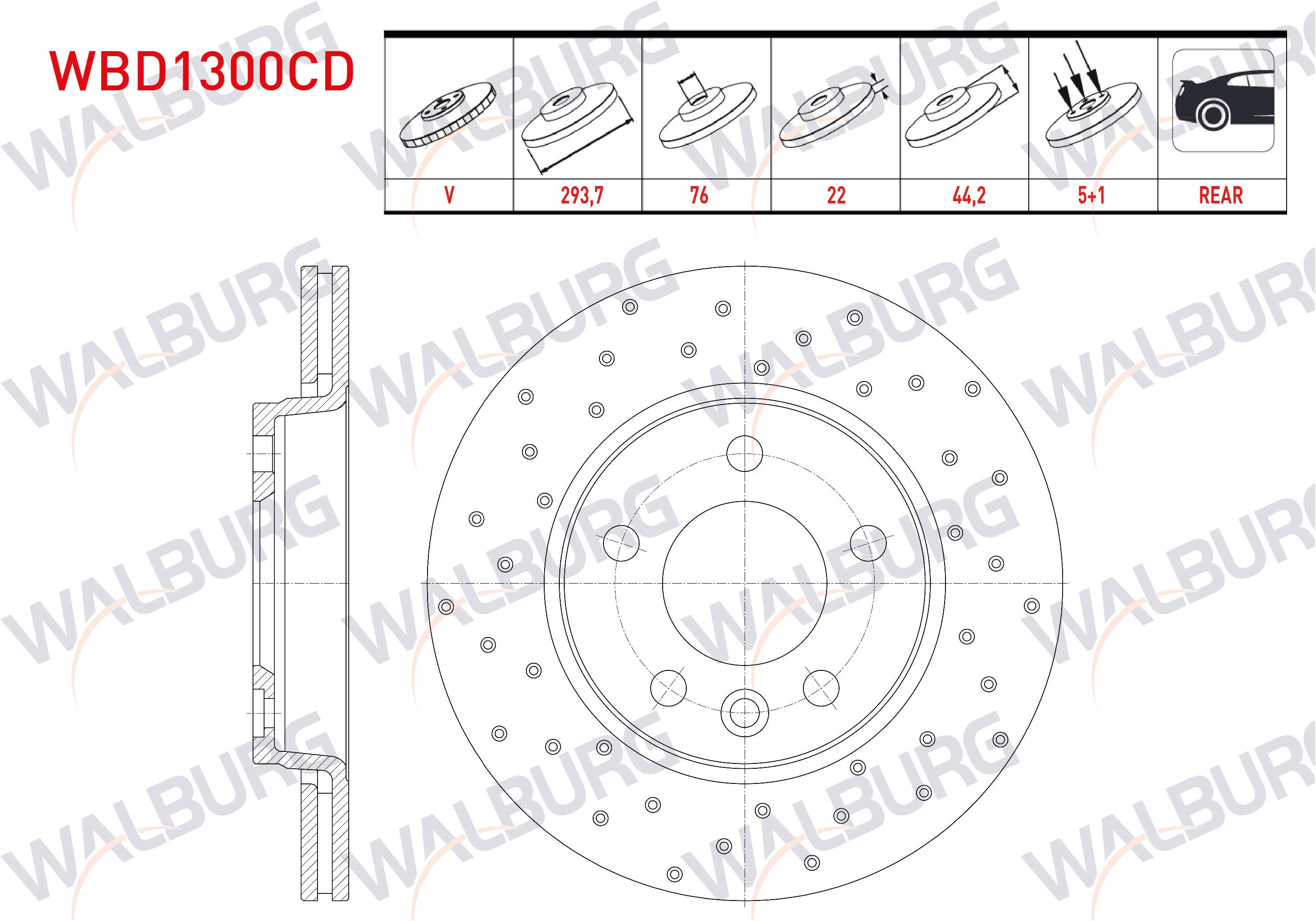 WALBURG WBD1300CD | Fren Diski Arka Havalı Kaplamalı Performans Delikli 5 Bjn 293,7X22x76x44,2 VW Transporter V 1.9 TDI-2.0 TDI-2.4-2.5 TDI 03-15 / Transporter VI 2.0 TDI 15-/ Transporter VII 2.0 TDI 19-/ Multıvan V 03-15 | 2 Adet