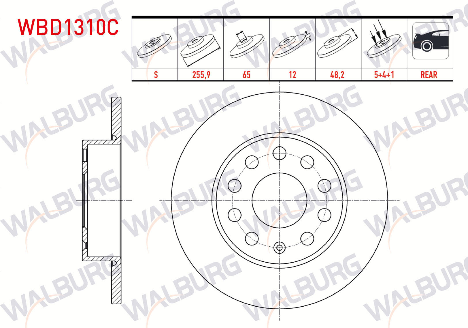 WALBURG WBD1310C | Fren Diski Arka Düz Kaplamalı 5 Bjn 255,9X12x65x48,2 Golf V-VI 1.4 TSI-1.6 TDI 2003-2013 / Caddy III 1.6 TDI-1.9 TDI 2004-201 / Jetta III 1.4 TSI-1.6İ 2005-2010 / Touran 1.4 TSI-1.6 TSI-2.0 TDI 2003-2010 | 2 Adet