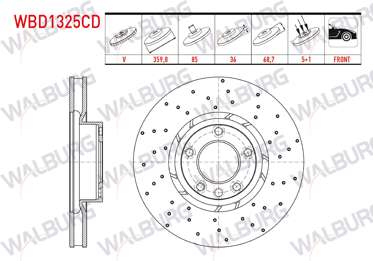 WALBURG WBD1325CD | Fren Diski Sol Ön Havalı Kaplamalı Performans Delikli 5 Bjn 359,80X36x85x68,7 Volkswagen Touareg (7P5) 3.0 TDI V6-3.0 TSI V6 2010-/ Porsche Cayenne 3.0 D-3.0 S Hybrıd-3.6 S-4.8 Gts-4.8 Turbo